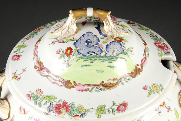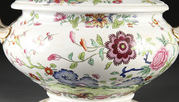 A VERY FINE PAIR OF COPELAND AND GARRETT IRONSTONE COVERED SOUP TUREENS, 19TH CENTURY. Decorated with polychrome peonies and flowers, pattern number 7407. height 10.75 inches (27 cm).
