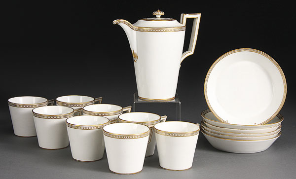 A FINE 19TH CENTURY MEISSEN TEA SET. 15 pieces comprising a lidded tea pot and six cups and saucers, each with gilt band decoration. Height 6 inches (15 cm).