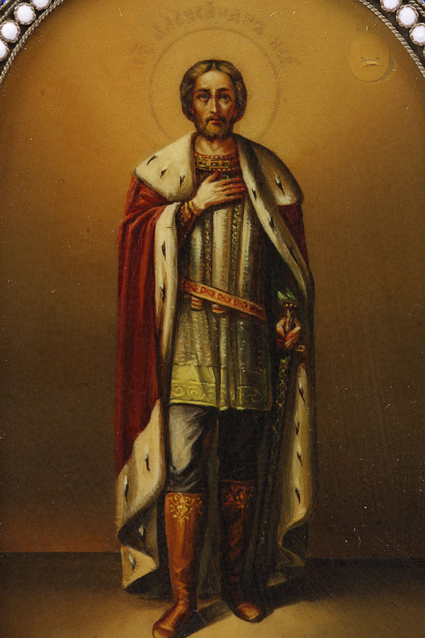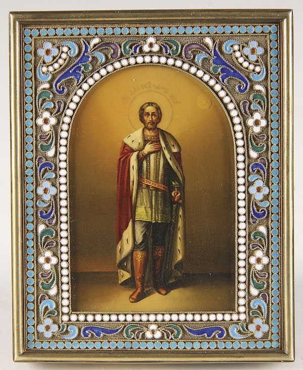 A RUSSIAN ICON OF ST. ALEXANDER NEVSKY, 2ND HALF 20TH CENTURY. Overlaid with a silver-gilt and cloisonne enameled riza. Bearing St. Petersburg hallmark circa 1890, the cyrillic maker's mark V.S. and 84 standard. 4 inches x 3.25 inches (10 x 8 cm).