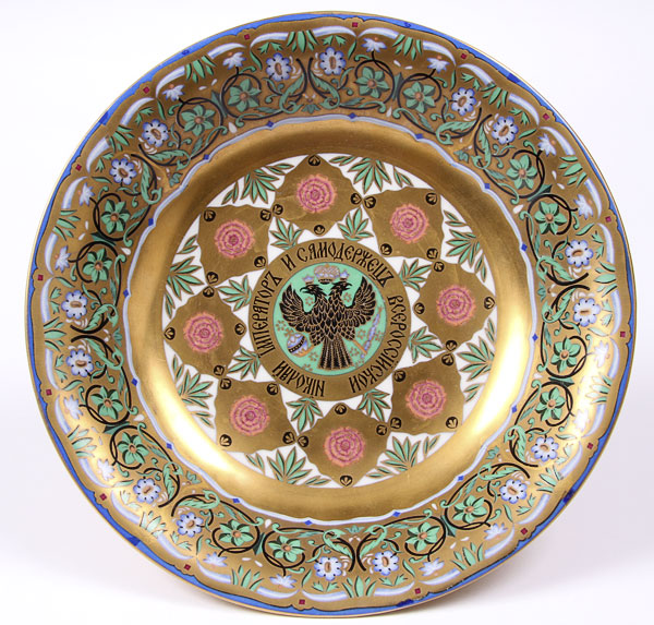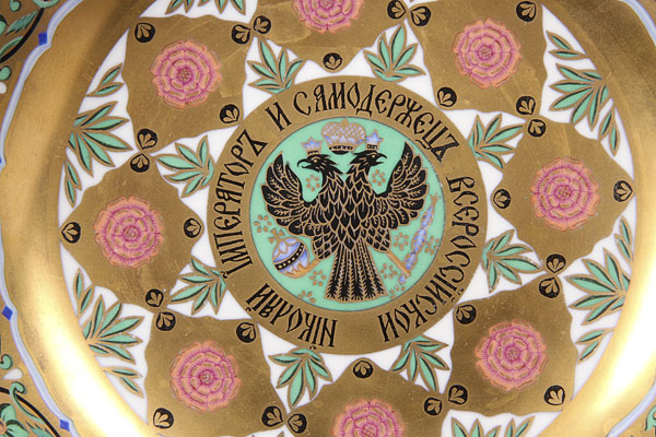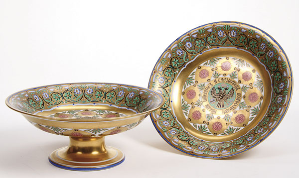 A PAIR OF KREMLIN DESSERT SERVICE STYLE GILT DECORATED PORCELAIN TAZZA, SECOND HALF 20TH CENTURY. Height 3.5 inches (8.8cm), diameter 8.75 inches (22.3cm).