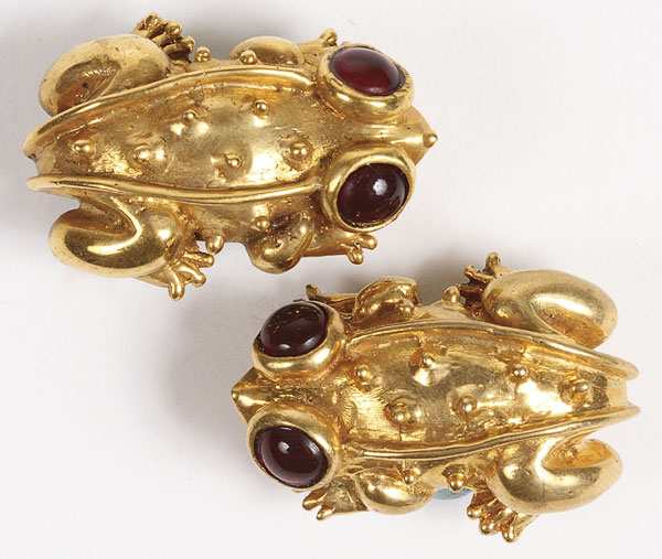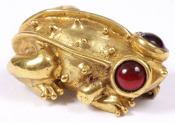 A PAIR OF GOLD FIGURAL "HORNED TOAD" PINS, 20TH CENTURY. Each set with red cabachon eyes. Unmarked, length 1.5 inches (4cm), weight 34 grams.