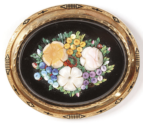 A VERY FINE VICTORIAN SCULPTED MICRO-MOSAIC AND GOLD BROOCH, 19TH CENTURY, PROBABLY ITALIAN. Of oval form with a carved and raised micro-mosaic floral group set on a black onyx tile within an enameled gold bezel. Unmarked. Length 2 inches (5 cm).