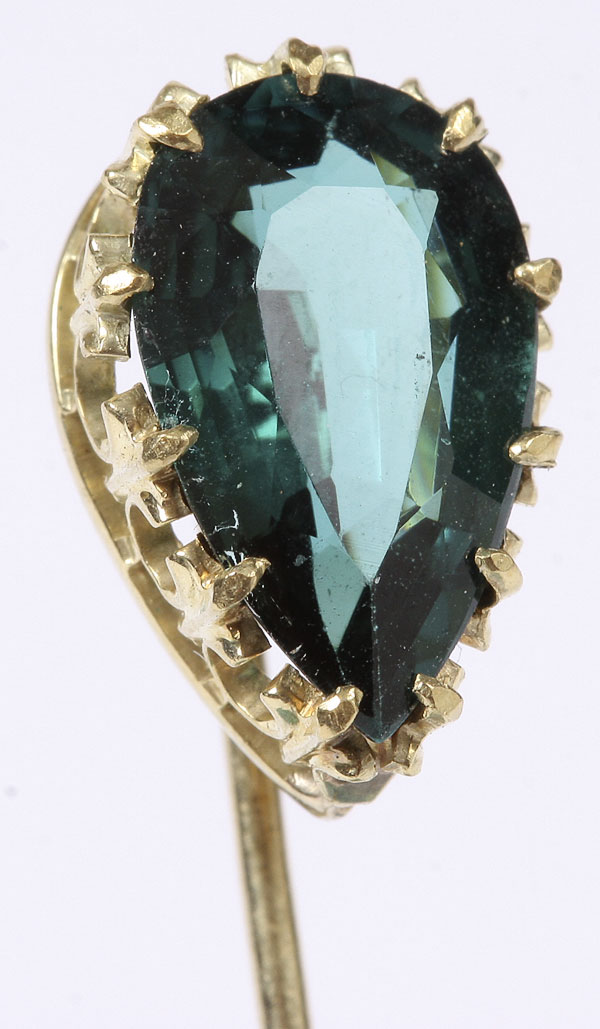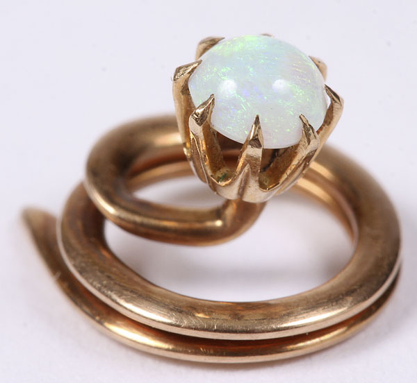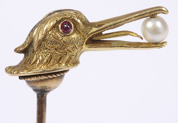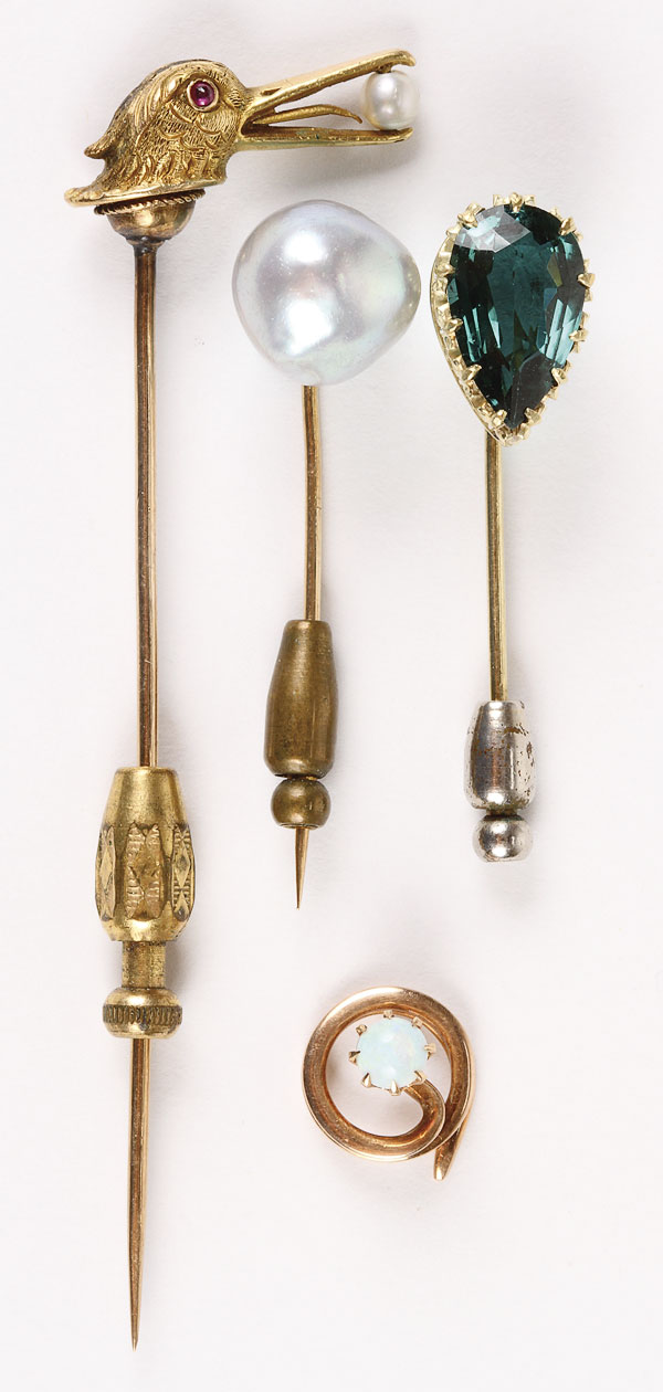 A GROUP OF FOUR VICTORIAN LAPEL/STICK PINS, Comprising an emerald mounted pearl stud, small opal stud and figural egret head with seed pearl, together with a green stone and silver - gilt crucifix.