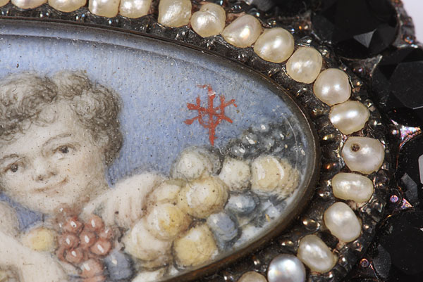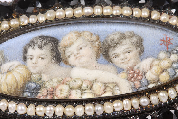 A FINE VICTORIAN IVORY, SEED PEARL AND GARNET BROOCH, LATE 19TH CENTURY. Of oval form finely painted with a scene of three putto and fruits within a seed pearl and cut garnet border in a gold filled mount, signed with a red UXI monogram upper right. Length 2.375 inches (6 cm).