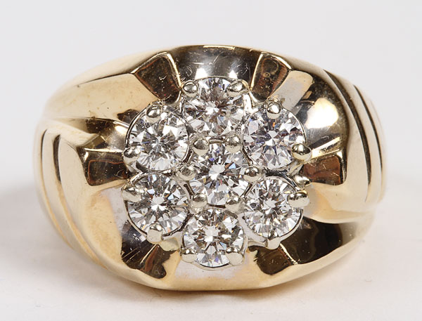 A FINE MANS DIAMOND CLUSTER AND 14K GOLD RING, 20TH CENTURY. Containing seven brilliant cut diamonds each approximately .30 carats,VVS-2 clarity and of good color. Stamped 14k.