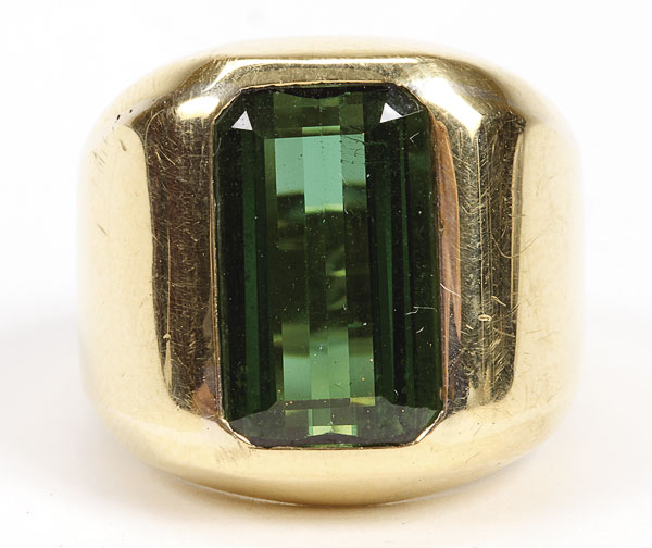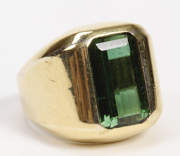 A VERY FINE MAN'S 18K GOLD AND BRAZILIAN EMERALD RING, LAST HALF 20TH CENTURY. The rectangular cut emerald of brillian green color and clarity, approximately 10 ct. (10 x 16 mm). Set in an 18K gold mount, weight 19 grams.