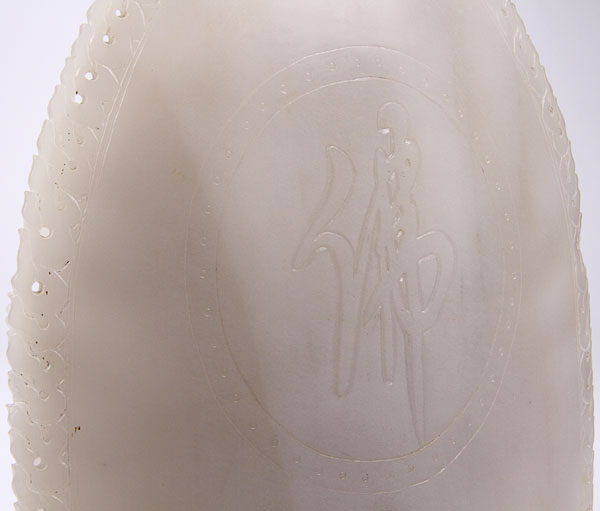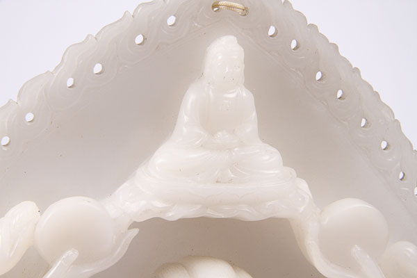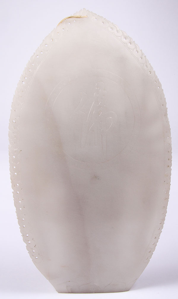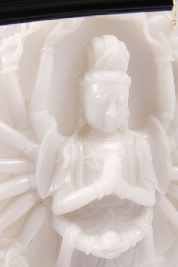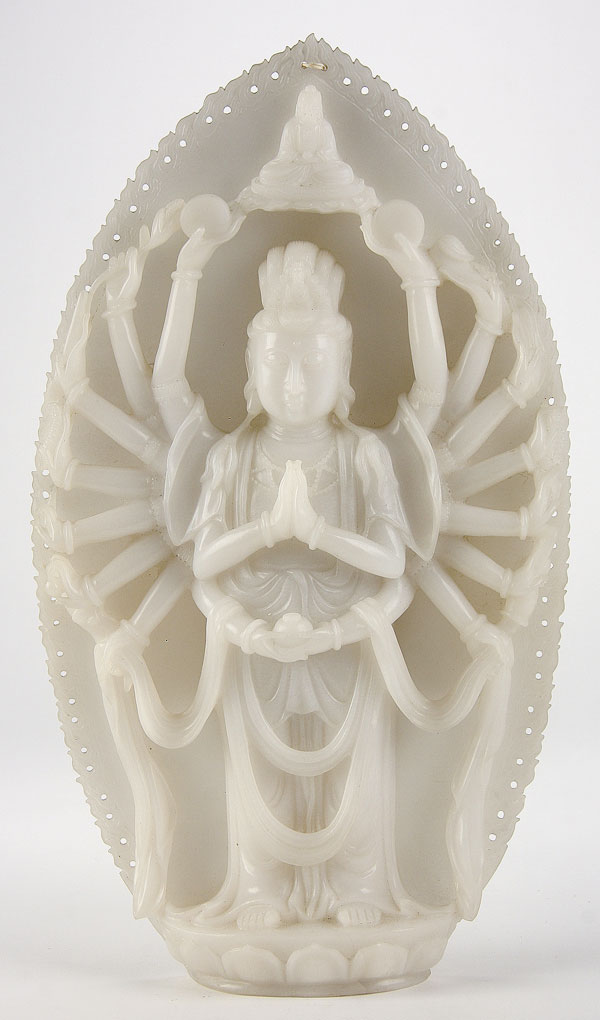 A LARGE CHINESE CARVED WHITE JADE GUANYIN, LATE 19TH/EARLY 20TH CENTURY. Well carved in an even toned semi translucent white jade in the form of a multi-armed Deity holding various Buddhist attributes and standing on a lotus form base with a large pierced flaming mandorla behind. Height 16.25 inches (41.3 cm).