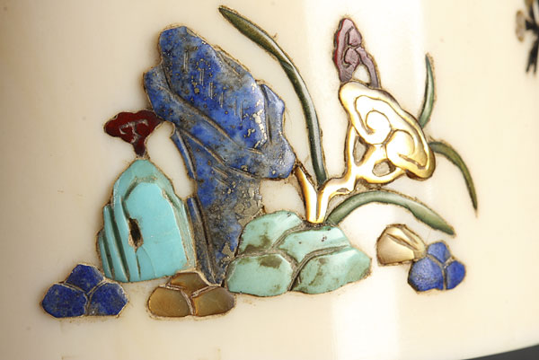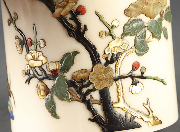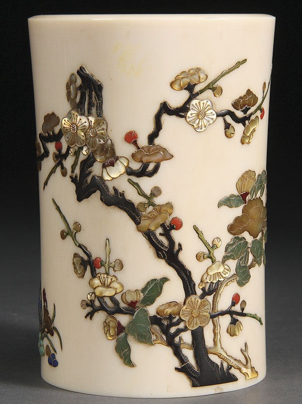 A VERY FINE JAPANESE IVORY AND SHIBAYAMA BRUSH POT, MEIJI PERIOD (1868-1912). Of cylindrical form inlaid with horn, mother of pearl, coral, hardstone, and blue lapis. Height 4.5 inches (11.5 cm).