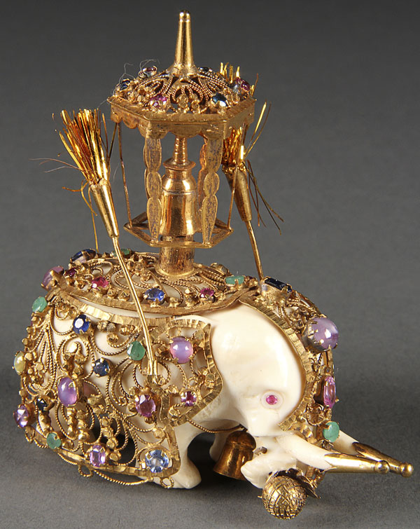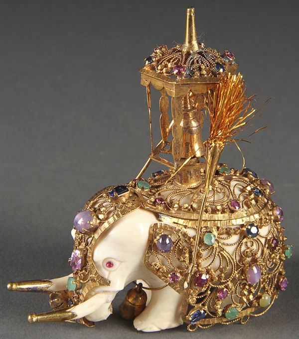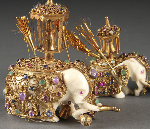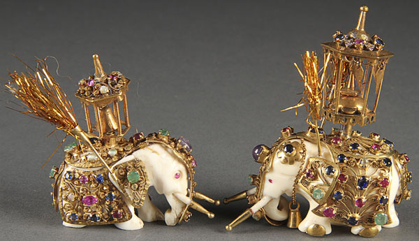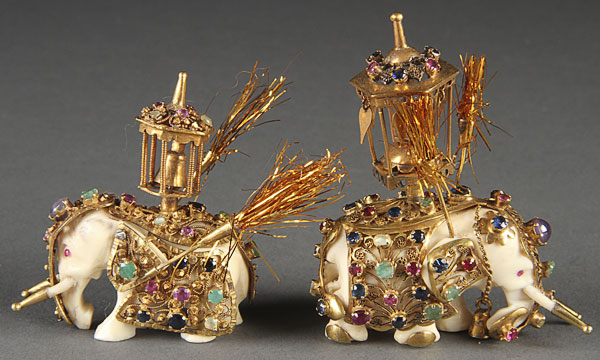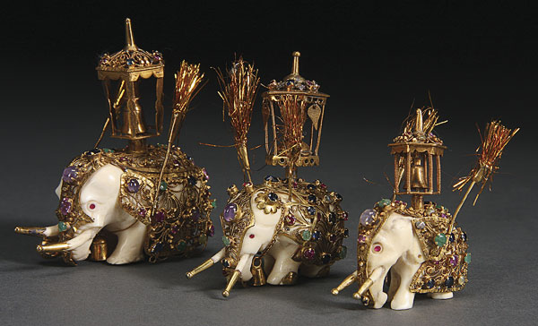 AN EXTREMELY FINE SET OF THREE IVORY, GOLD AND GEM STONE MOUNTED ELEPHANTS, SRI LANKA, 20TH CENTURY. The diminutive graduated figures realistically carved and overlaid with 20-22 karat tooled gold (unstamped) saddle cloths as outfitted for a wedding procession, each containing approximately 50 semi-precious gemstones of various size including rubies, emeralds and sapphires. Height 1.75 inches (4.5 cm) to 2.75 inches (7 cm).