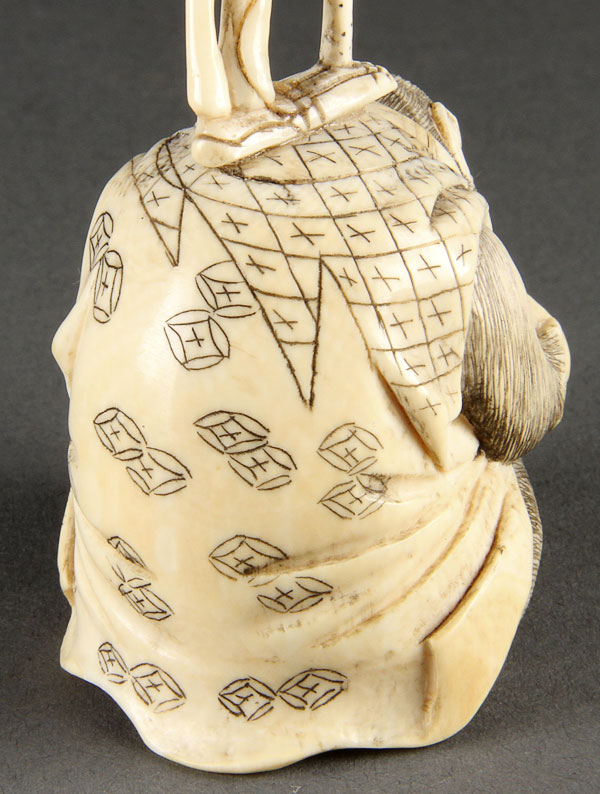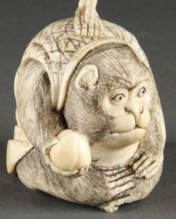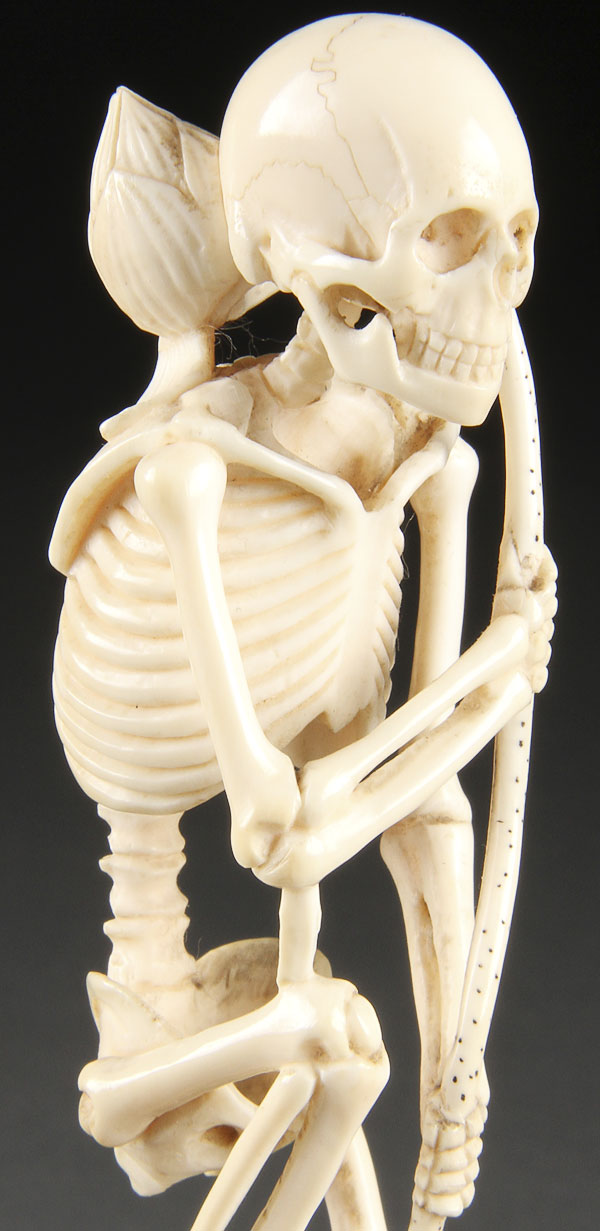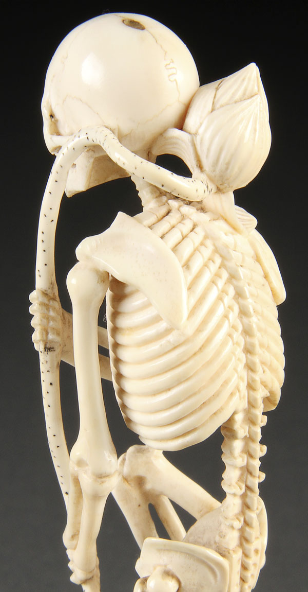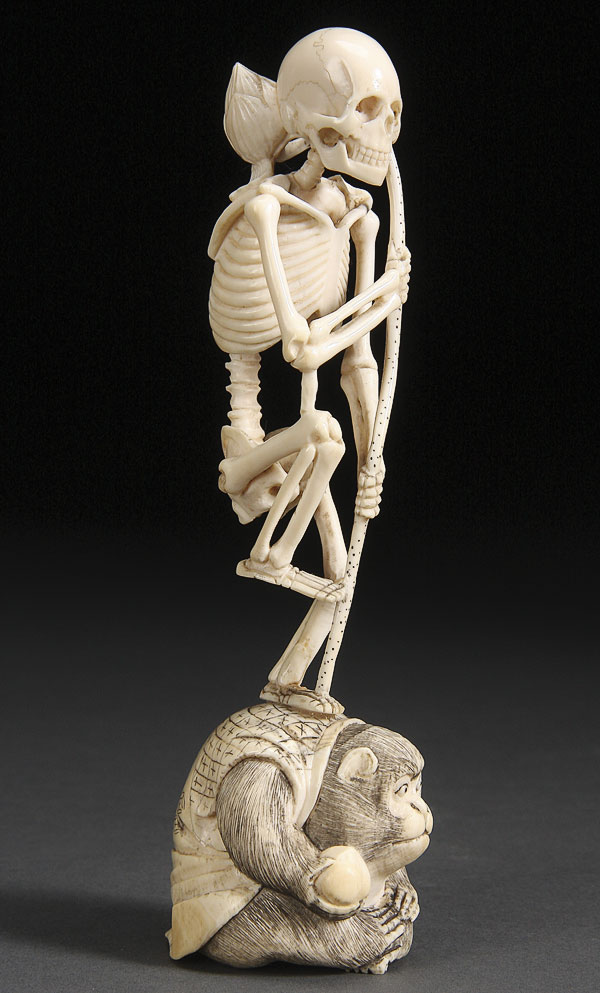 A JAPANESE CARVED IVORY OKIMONO OF A SKELETON AND MONKEY, MEIJI PERIOD. Depicting the finely detailed and delicately carved figure of a skeleton standing on one leg with a lotus branch staff atop a seated monkey wearing a "happi" coat and holding a peach, inscribed marks on base. Height 6 inches (15.2 cm).