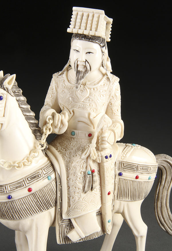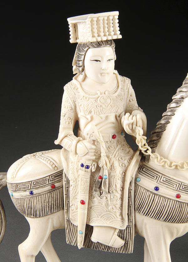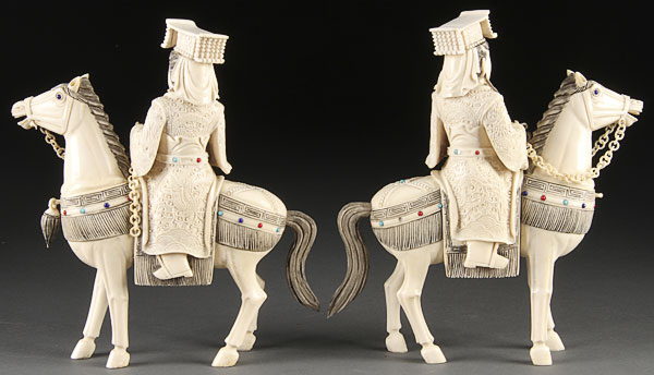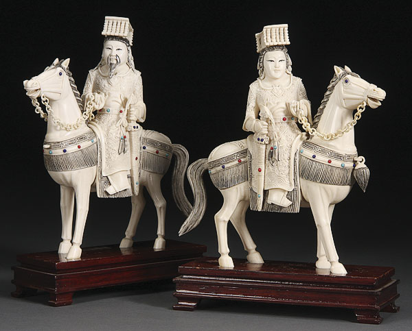 A PAIR OF JAPANESE CARVED IVORY FIGURES, 20TH CENTURY. Modeled as a Ming style emperor and empress mounted on horseback and decorated with glass jewels. The ivory height 8.25 inches (21 cm).