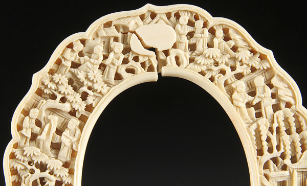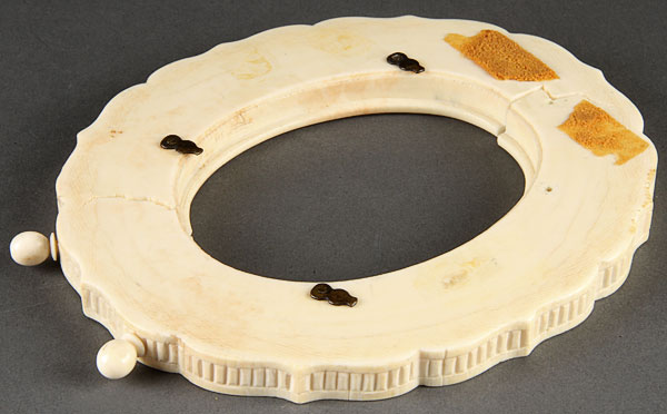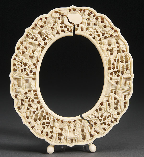 A CHINESE EXPORT CARVED IVORY PICTURE FRAME, 19TH/20TH CENTURY. Of oval scalloped form, carved with a complex scene of figures and pavilions in deep relief. Height 5.75 inches (14.5 cm).