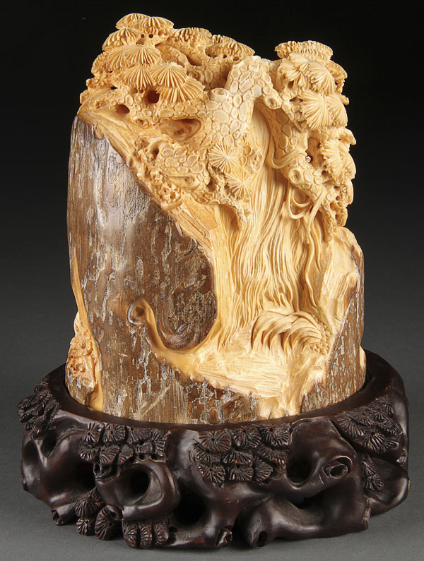 A LARGE ORIENTAL CARVED IVORY OKIMONO, 20TH CENTURY. Finely carved and polished in fossilized mammoth ivory, modeled as a partially nude young beauty, seated atop a tiger behind rockery and pine branches, fitted in a matching hardwood stand. Height 8.5 inches (21.5 cm).