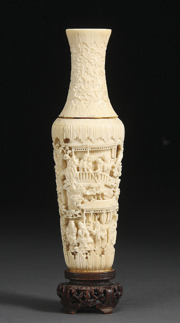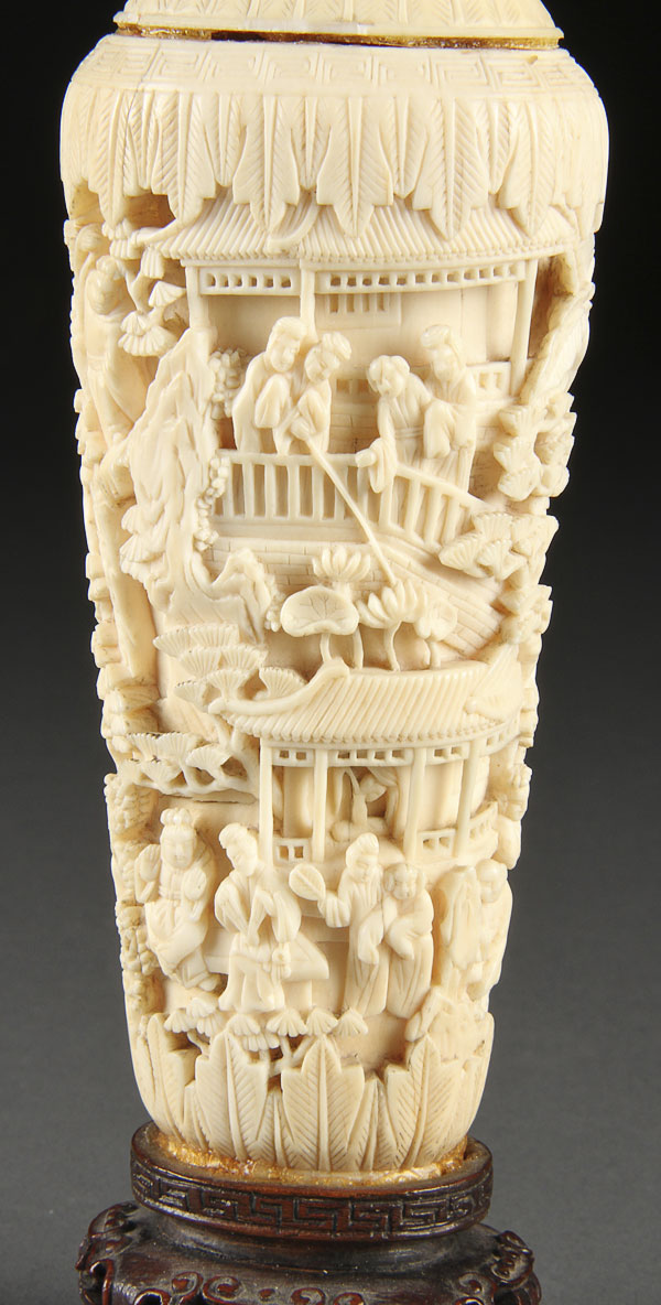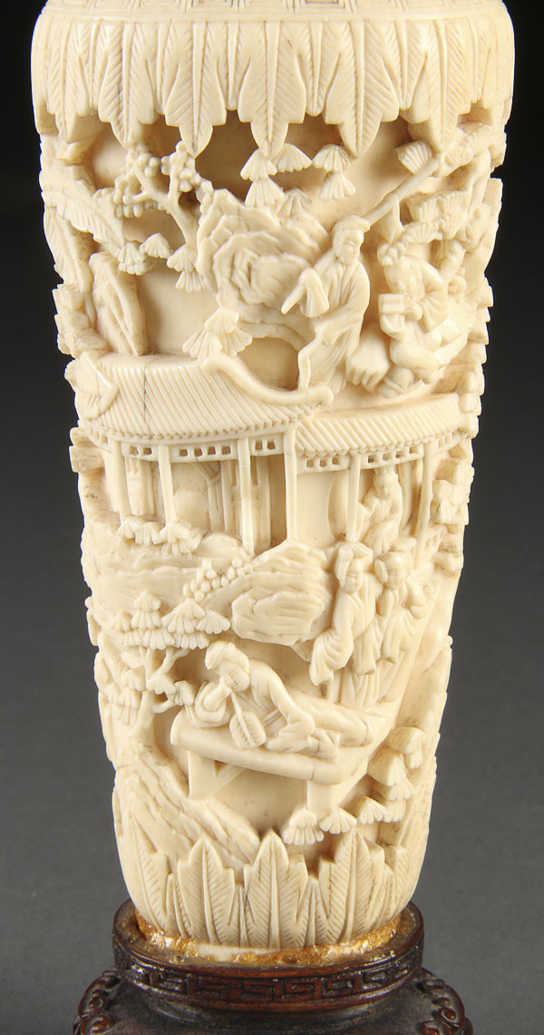 A CHINESE CARVED IVORY SCENIC VASE, 19TH/20TH CENTURY. Finely carved in deep relief with detailed figures, pavilions and pine trees, raised on an open work hardwood base. Total height 8 inches (20.5 cm).