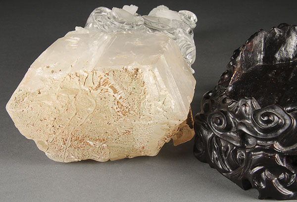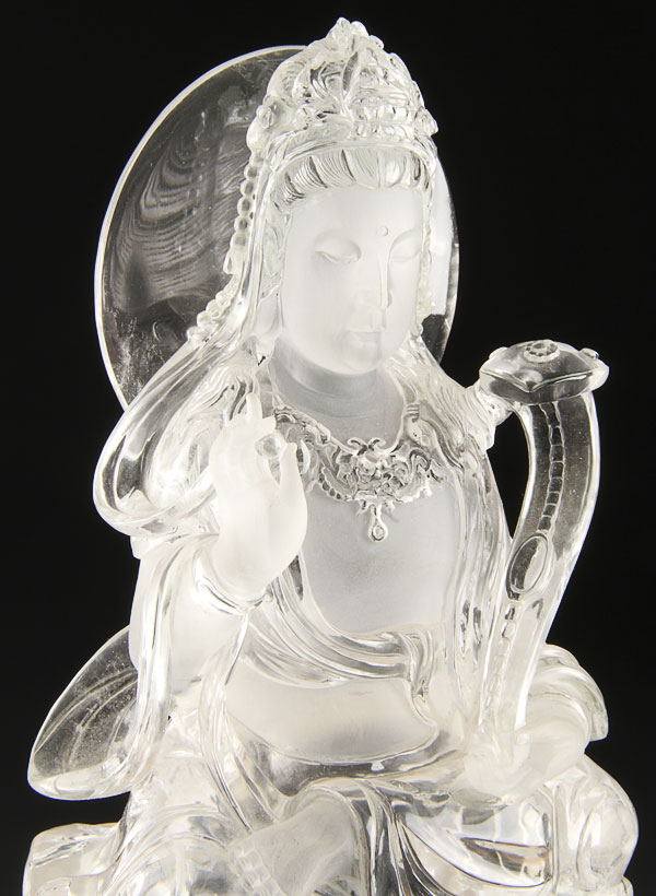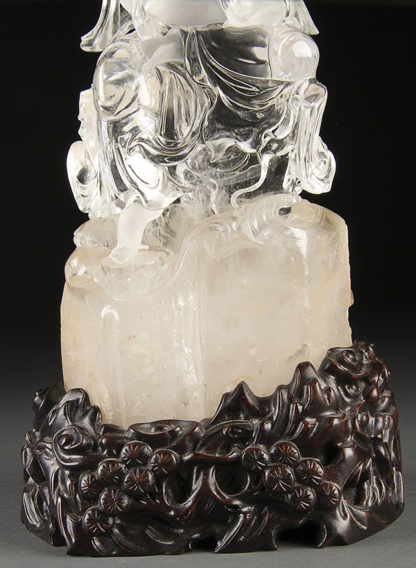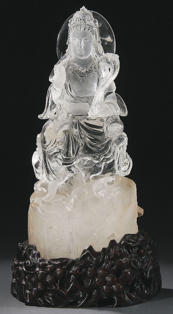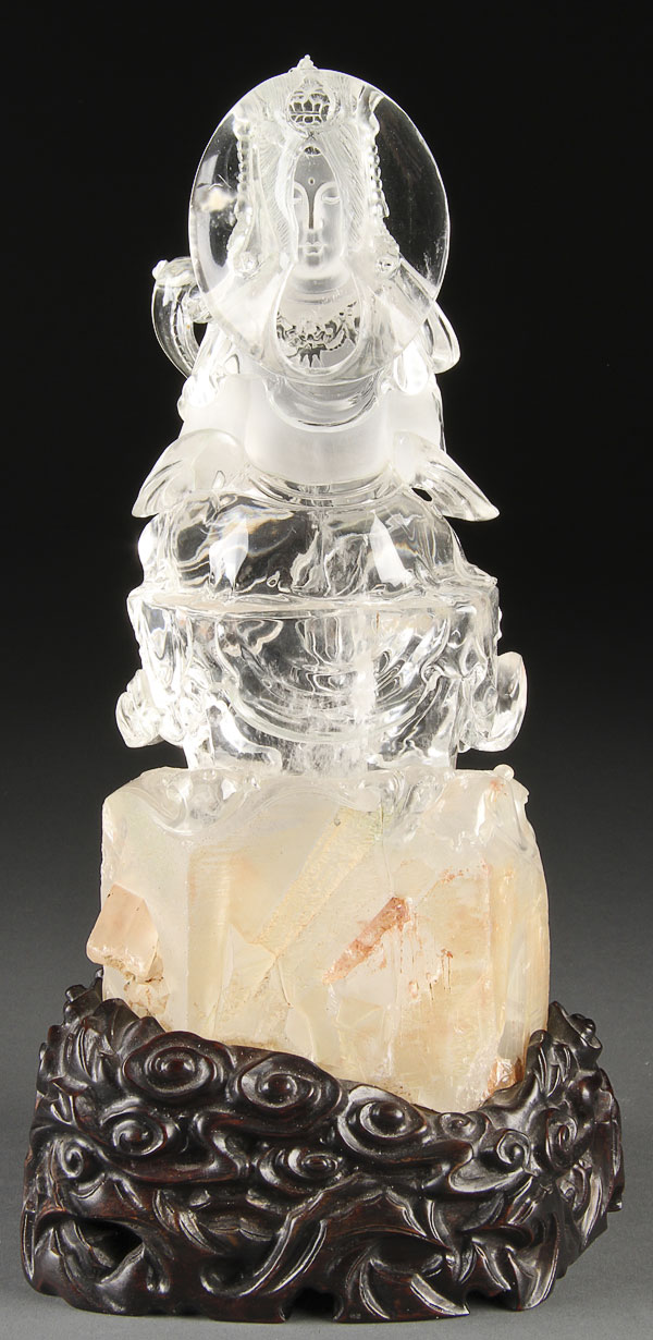 A LARGE AND IMPRESSIVE CHINESE CARVED ROCK CRYSTAL GUANYIN, 19TH/20TH CENTURY. Finely carved in a nearly perfect crystal with the seated form of a Guanyin in a position of Royal ease, holding a Ruyi Scepter and rising from the natural crystal formation set in an elaborate carved hardwood stand. Height 12.75 inches (32.5 cm).