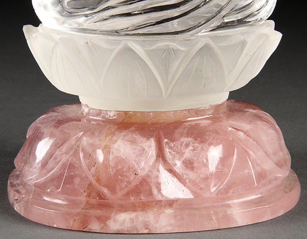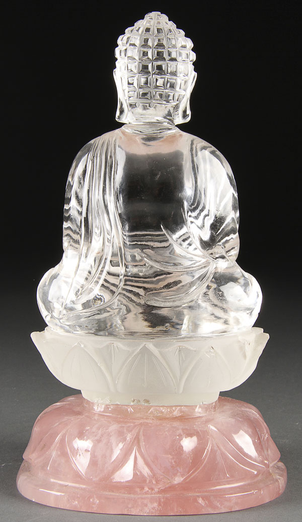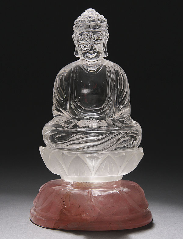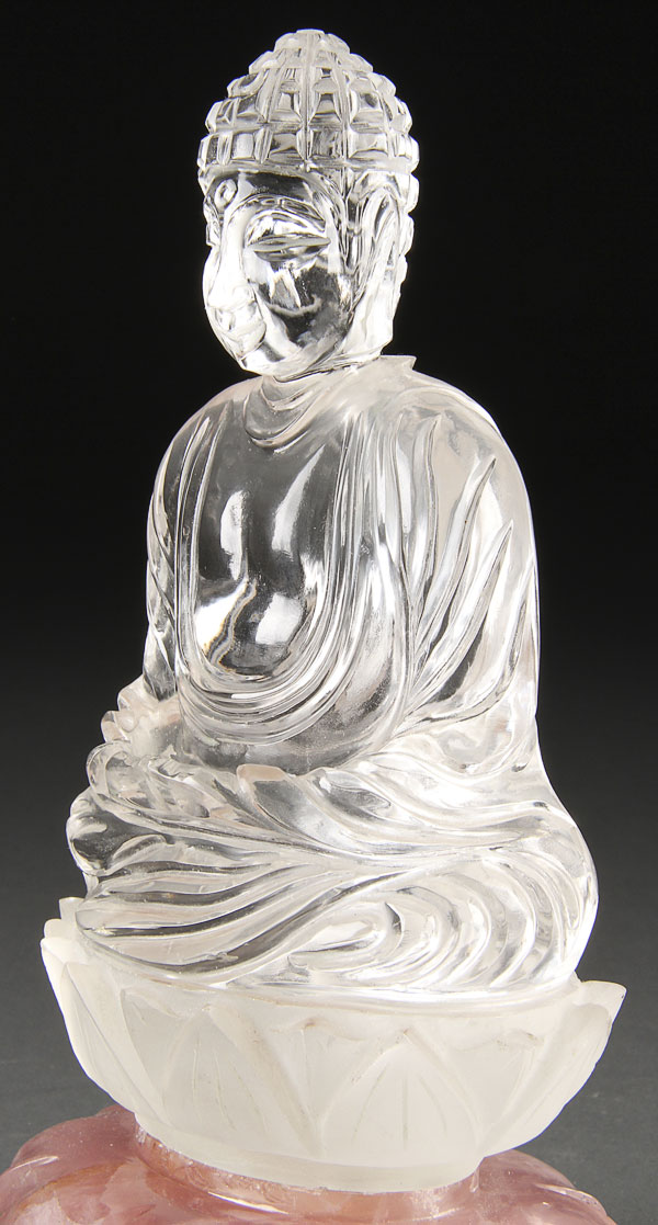 A FINE CHINESE CARVED ROCK CRYSTAL BUDDHA, 20TH CENTURY. In nearly flawless rock crystal and finely carved with the seated form of Buddha raised on a lotus blossom throne and further raised on a carved Rose quartz crystal lotus form pedestal. Height 8 inches (20 cm).