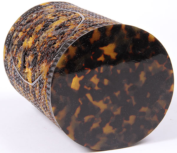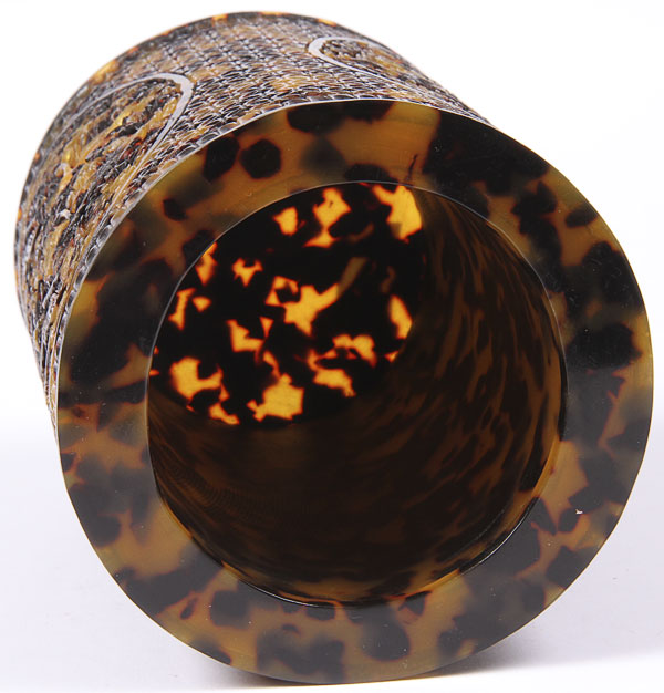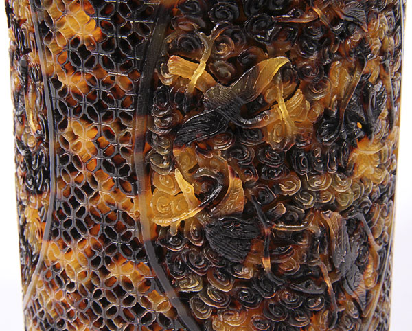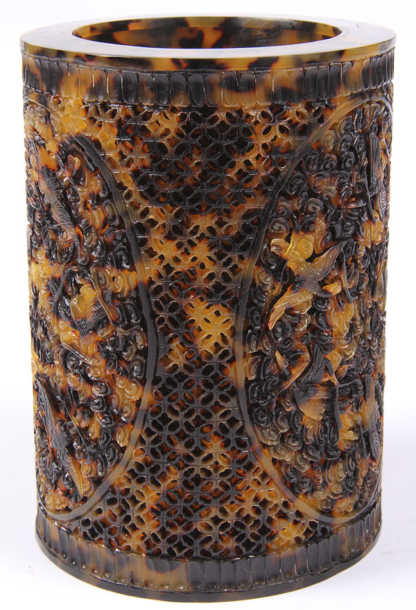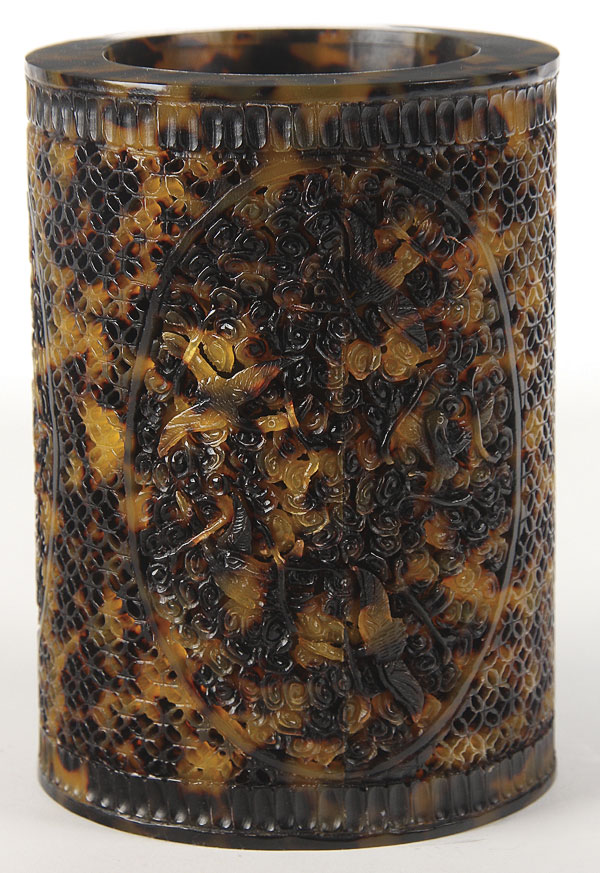 AN EXTREMELY WELL CARVED CHINESE TORTOISE SHELL BRUSH POT, 19TH/20TH CENTURY. The double walled cylindrical pot finely carved on the exterior with an open work design of flying cranes, each loosely suspended in cloud forms within oval cartouches on an openwork diaper ground. Height 5.75 inches (14.5 cm).