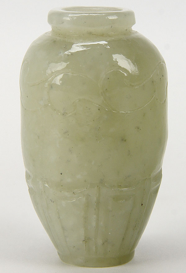 A CHINESE CARVED WHITE JADE MINIATURE CABINET VASE, 19TH/20TH CENTURY. Carved in an even toned and semi-translucent white jade with archaistic designs. Height 2.25 inches (5.5 cm).