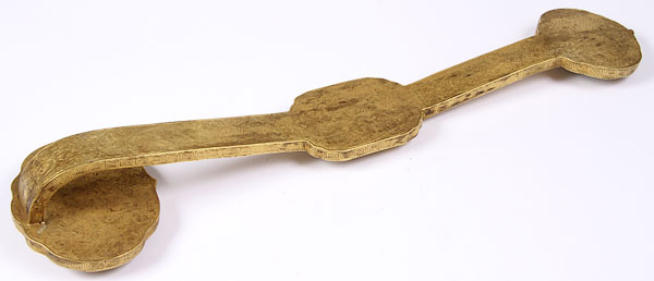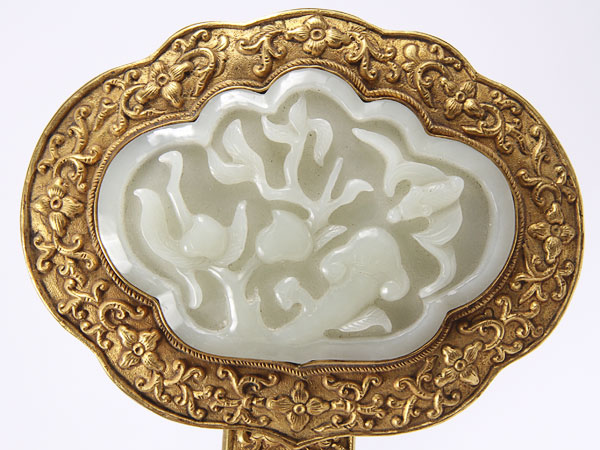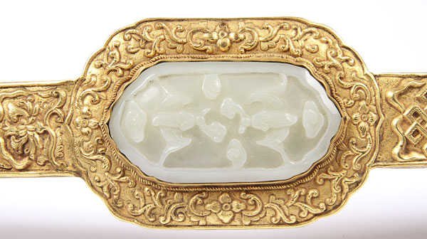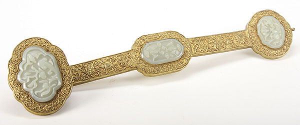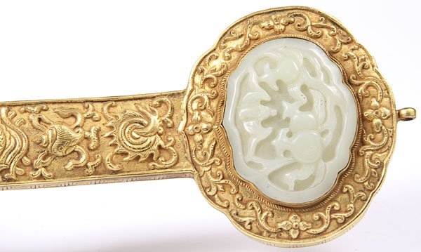 A VERY FINE CHINESE CARVED WHITE JADE AND GILT BRONZE RUYI SCEPTER, 19TH/20TH CENTURY. The three white jade plaques of even toned pale celadon white jade well carved in good relief with bats and fungus set in a gilt bronze Ruyi form scrolled scepter embossed with auspicious Buddhist symbols. Length 21.5 inches (54.5 cm).
