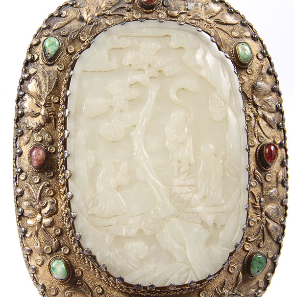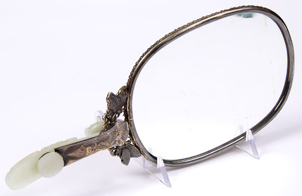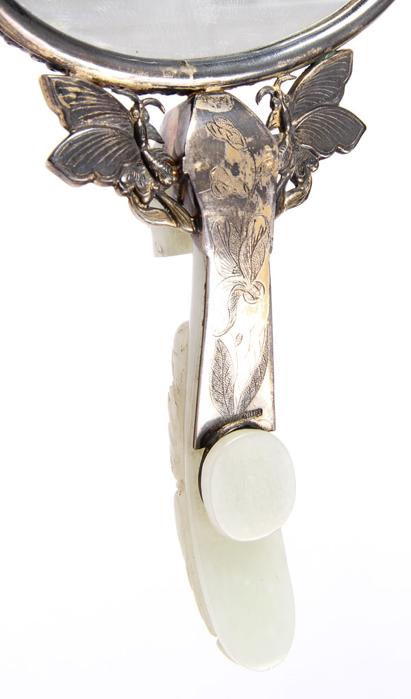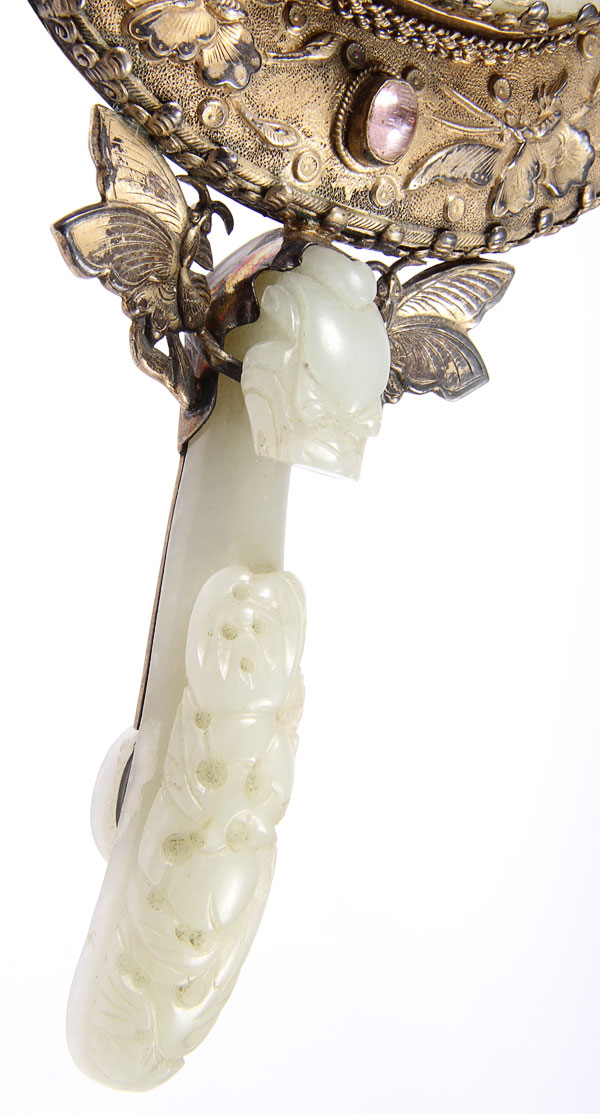 A VERY FINE CHINESE CARVED WHITE JADE PLAQUE AND BELT HOOK SILVER-GILT HAND MIRROR, QING DYNASTY. With later mountings, The white jade of a good pale celadon and even tone, carved as a plaque with three immortals in a mountain setting and a dragonhead, peach and citron handled belt hook later mounted as a hand mirror, the frame with embossed butterflies, set with jade and semi-precious stones. Stamped "silver". Length 9.75 inches (24.5 cm).