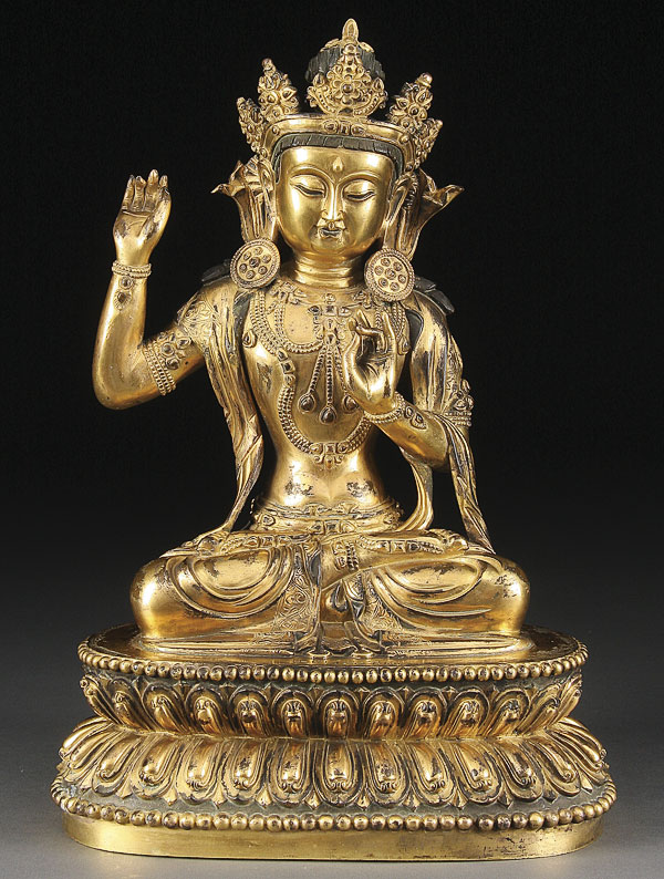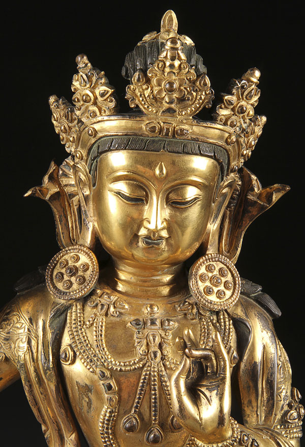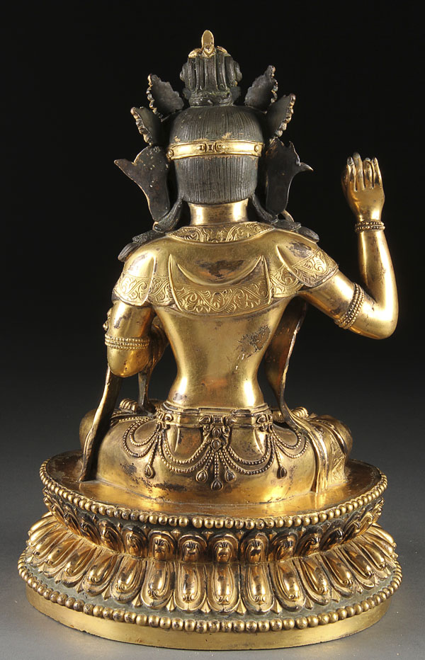 A FINE LARGE SINO-TIBETAN GILT BRONZE FIGURE OF SHIVA, PROBABLY 18TH/19TH CENTURY. Depicted in seated form atop a lotus form throne with calligraphy inscription and incised lotus mark on base. Height 13.75 inches (35 cm).
