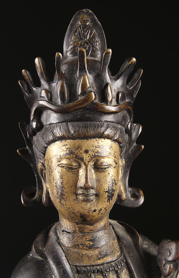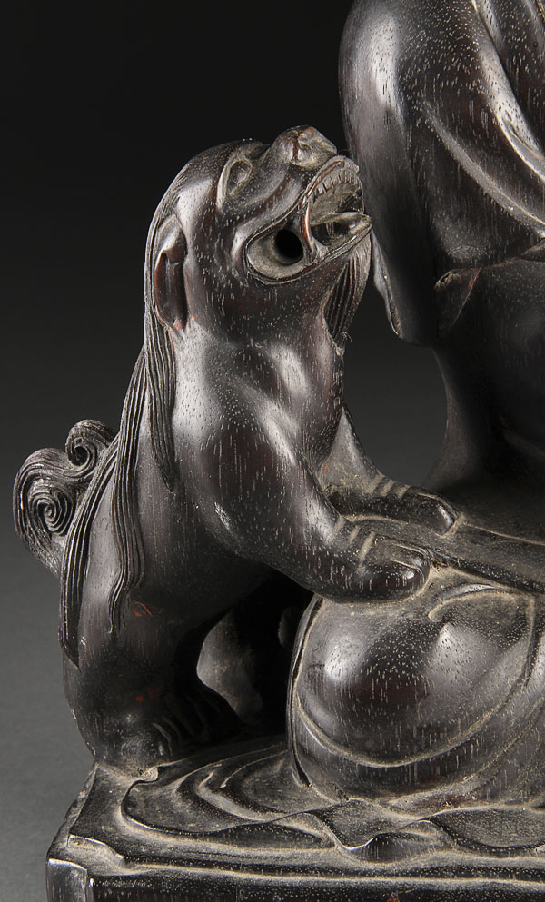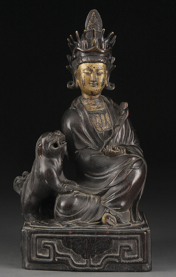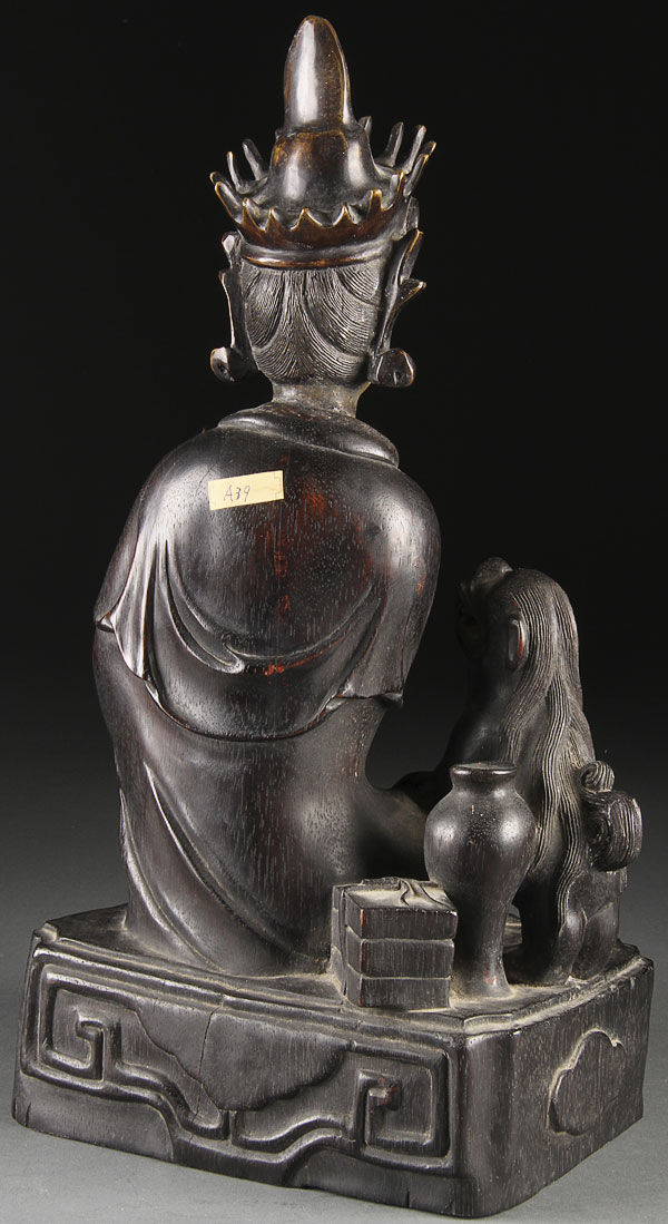 A CHINESE CARVED ZITAN WOOD AND BRONZE GUANYIN, QING DYNASTY. The well carved and sculpted figure in seated form with Ruyi scepter and foo dog at side surmounted with a bronze head with gilt features. Height 15.5 inches (39.5cm).