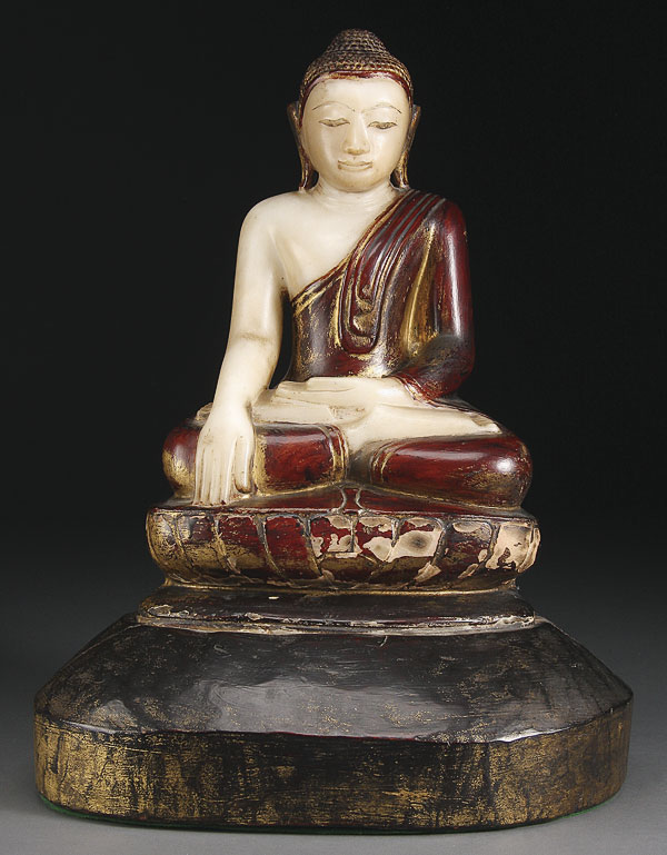 A SINO-TIBETAN CARVED AND POLYCHROME MARBLE BUDDHA. Depicted in seated form with red polychrome and gilt robes raised on a carved wood plinth. Height 21.25 inches (54 cm).