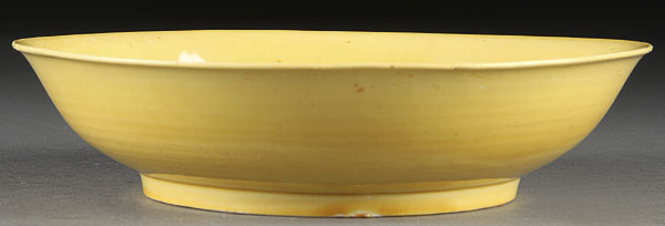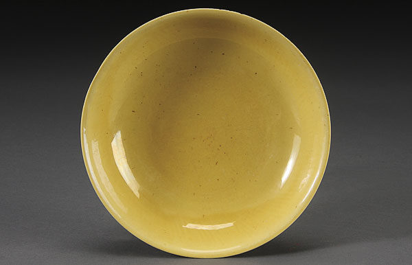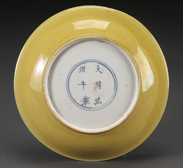 A FINE CHINESE MING YELLOW-GLAZED DISH HONGZHI SIX CHARACTER MARK WITHIN DOUBLE CIRCLES AND OF THE PERIOD (1488-1505). Raised on a low foot with gently rounded sides rising to an everted rim covered inside and out with a rich egg yolk-yellow tone glaze. Diameter 6.375 inches (16.3 cm).