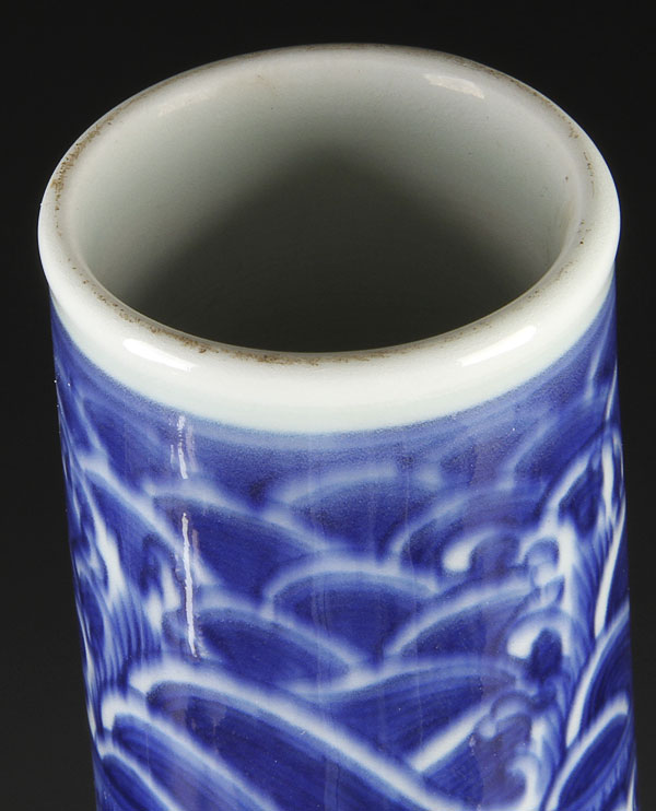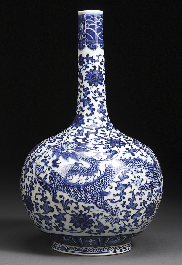 A LARGE AND IMPRESSIVE CHINESE MING STYLE BLUE AND WHITE PORCELAIN DRAGON BOTTLE VASE. Finely decorated in the round with two highly detailed dragons among interlocking lotus blossoms and leaves below an elongated neck with stylized wave form border. Qianlong seal mark on base in underglaze blue. Height 17.75 inches (45 cm).