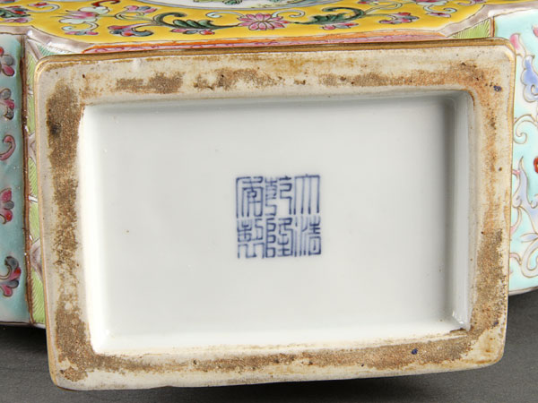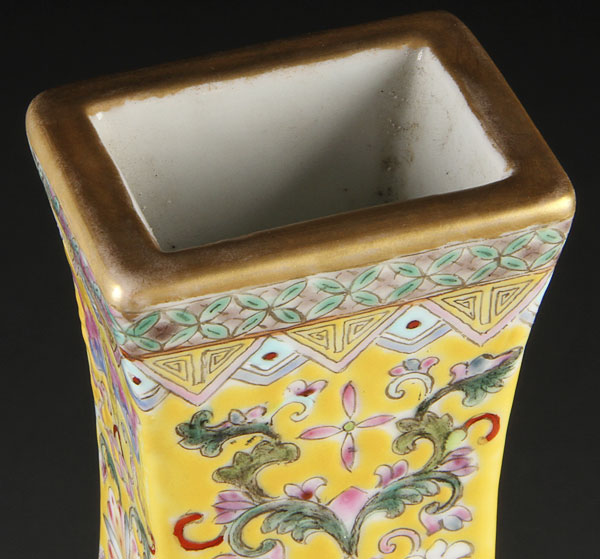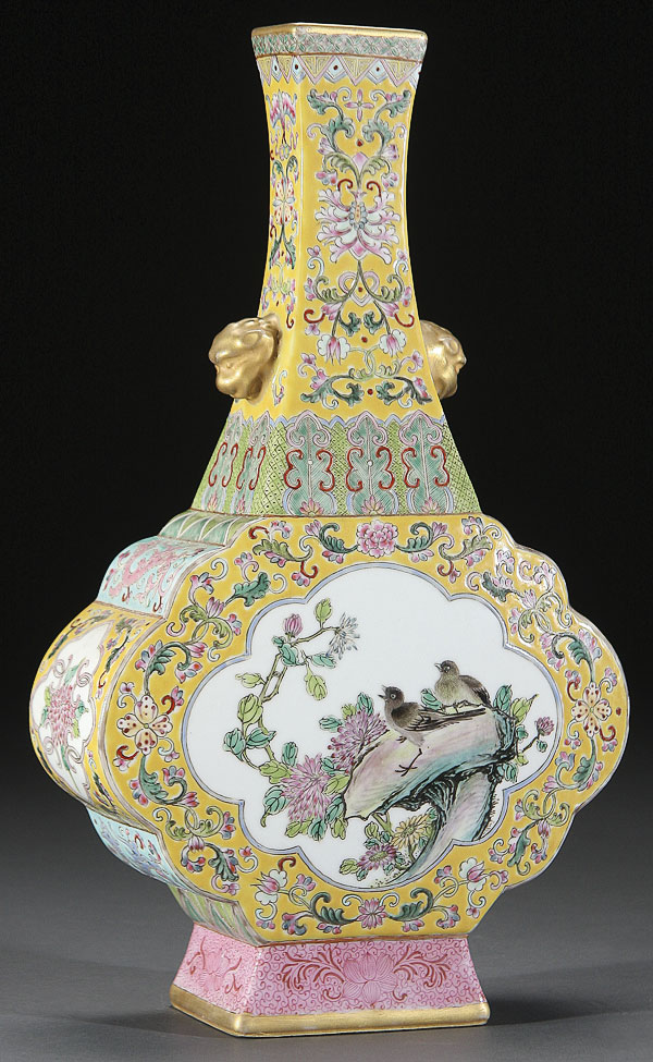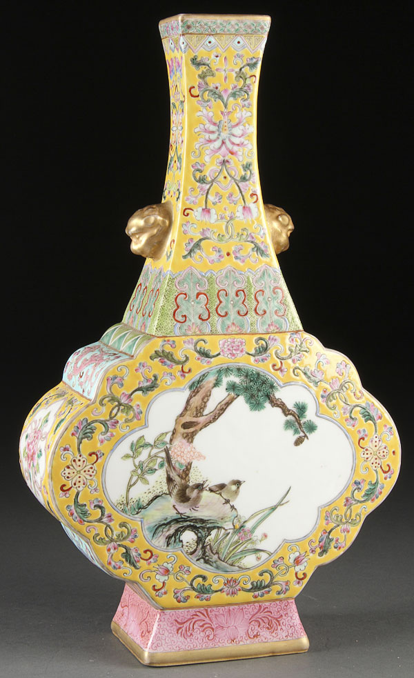 A VERY FINE CHINESE FAMILLE ROSE YELLOW GROUND "BIRDS" VASE OF FLATTENED FLASK FORM. Finely enameled with a scalloped medallion of birds on rockery with lotus blossoms and prunes branch below an elongated squared wasted neck with gilt Kylin mask handles the base with Qianlong seal mark underglaze. Height 14.5 inches (37 cm).