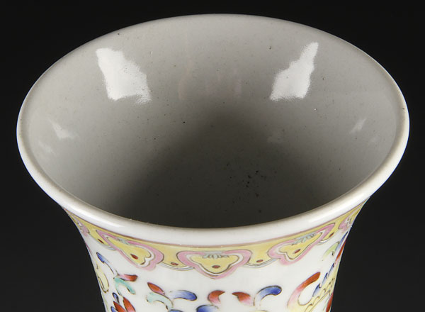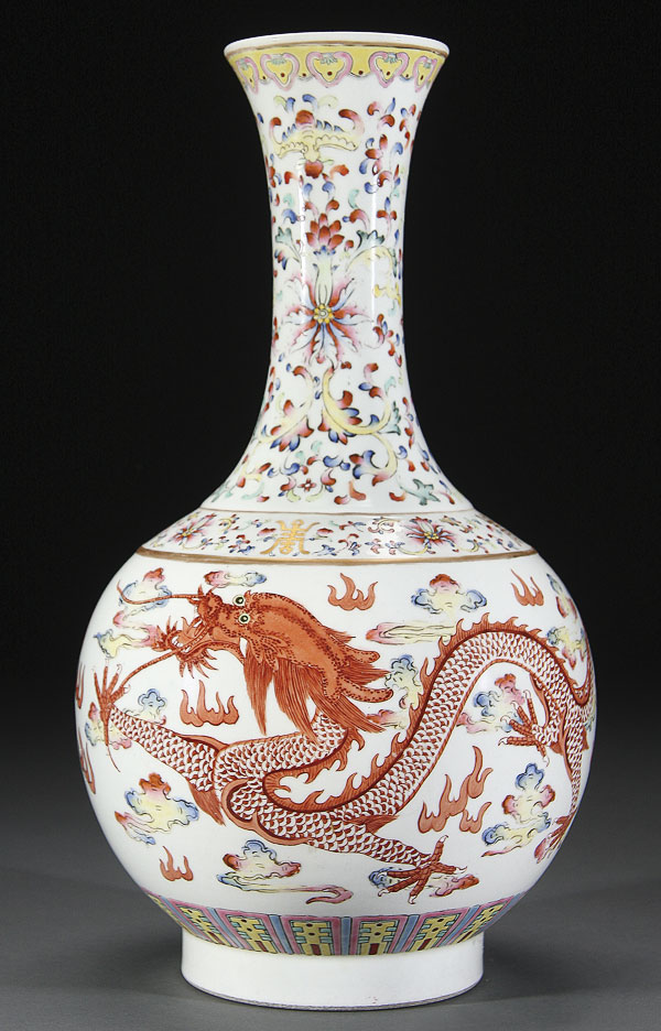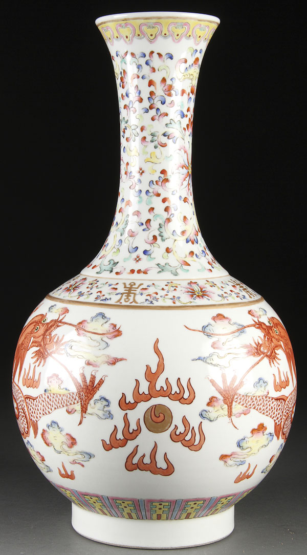 A LARGE AND IMPRESSIVE CHINESE FAMILLE ROSE AND COPPER RED "DRAGON" PORCELAIN BOTTLE VASE. Finely painted with two opposing well detailed dragons and polychrome cloud forms below elongated wasted neck with scrolled polychrome foliates, the base with blue double circled mark within a raised short foot rim. Height 16.75 inches (42.5 cm).