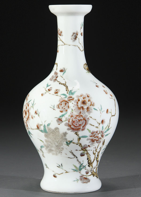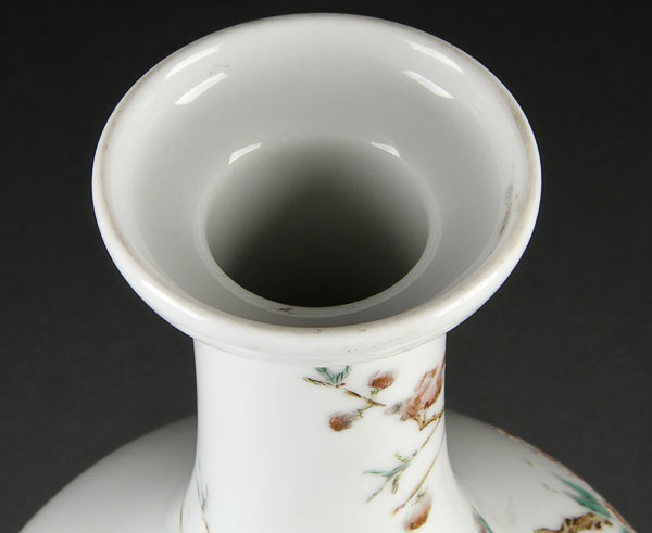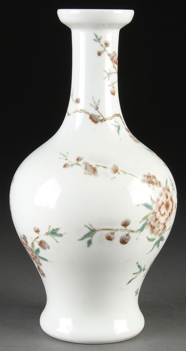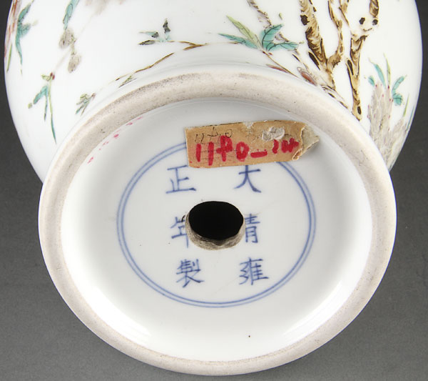 A CHINESE FAMILLE ROSE "LOTUS AND BUTTERFLIES" PORCELAIN BOTTLE VASE ENAMELED WITH LOTUS BLOSSOMS, PRUNUS BRANCHES AND TWO BUTTERFLIES IN FLIGHT. The base with Yongzheng six character mark in blue underglaze within double circles (later drilled for lamp). Height 10.75 inches (27.3 cm).