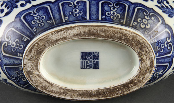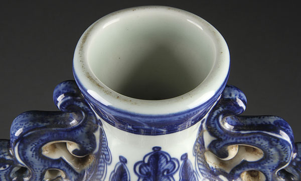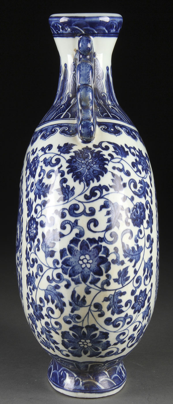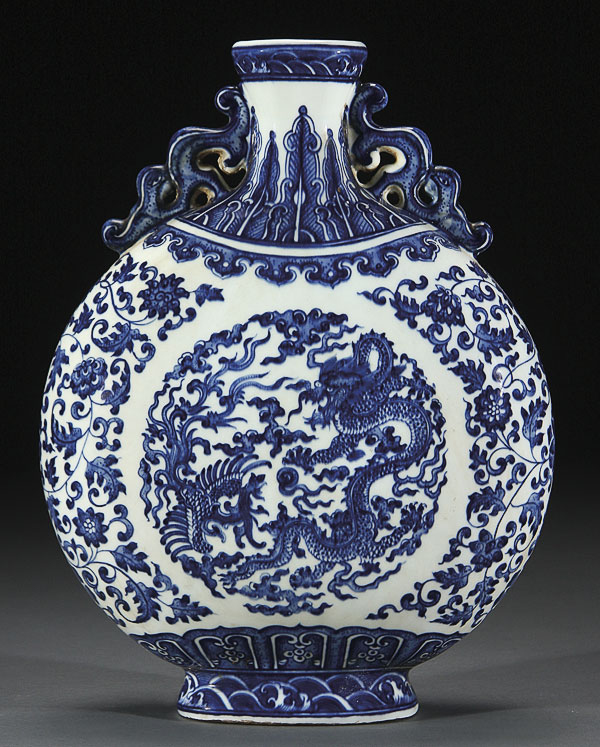 A GOOD CHINESE MING STYLE BLUE AND WHITE PORCELAIN "DRAGONS" MOON FLASK. Decorated with a large central scene of a battling dragon and phoenix within interlocking lotus and scrolled foliates below reticulated Kylin handles, blue underglaze Qianlong mark on base. Height 13.25 inches (33.5 cm).
