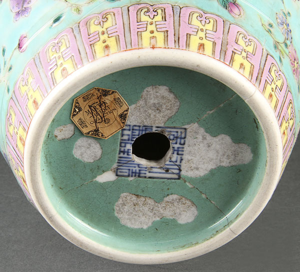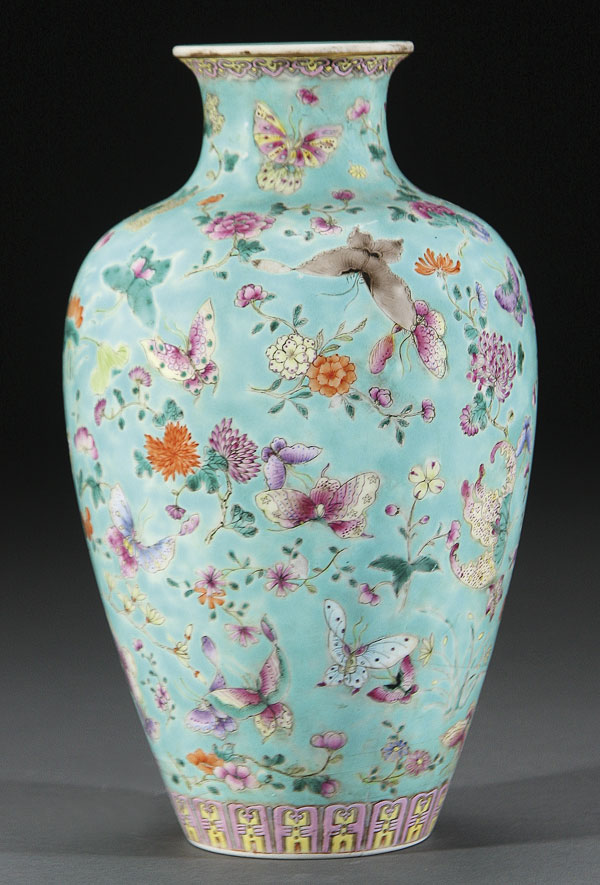A CHINESE QING PERIOD FAMILLE ROSE "FLOWERS AND BUTTERFLIES" PORCELAIN VASE. Finely enameled in great detail with numerous polychrome butterflies and floral blossoms on a turquoise ground Qianlong seal mark (later drilled for lamp with extending hairlines). Height 10.25 inches (26 cm).