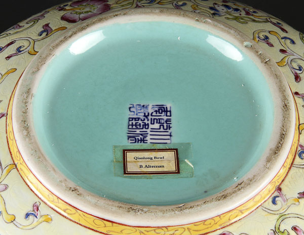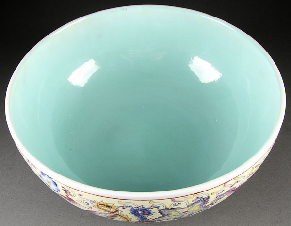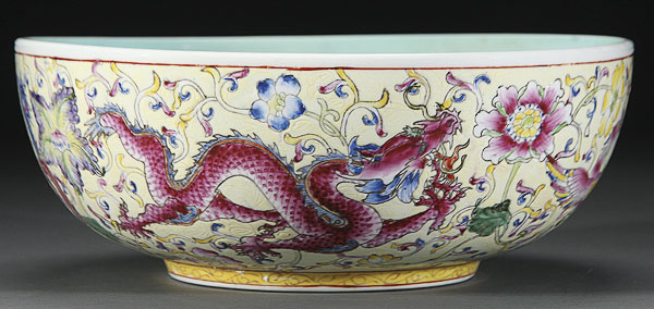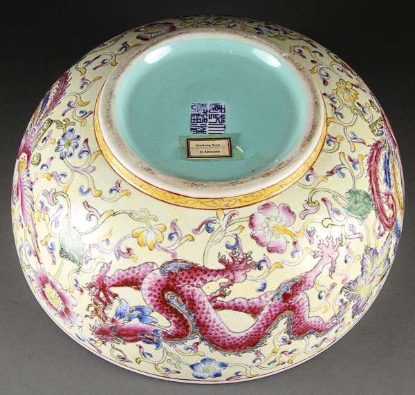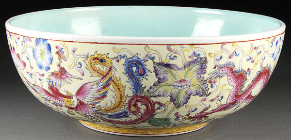 A LARGE AND IMPRESSIVE CHINESE YELLOW GROUND FAMILLE ROSE PORCELAIN "DRAGONS AND PHOENIX BOWL". Finely painted with two large dragons and two phoenix with polychrome foliates on a sgraffito and yellow ground, Qianlong seal mark in blue underglaze within a turquoise ground. Diameter 12.25 inches (31.3 cm).