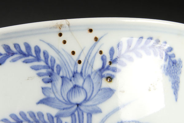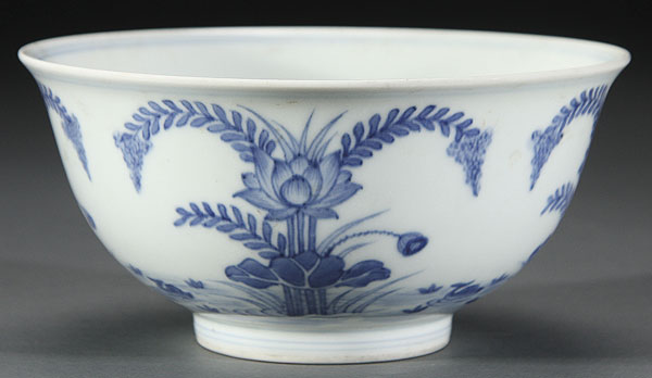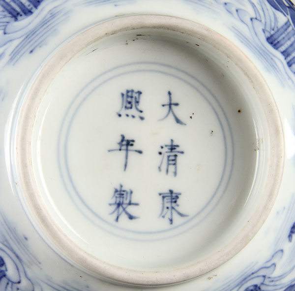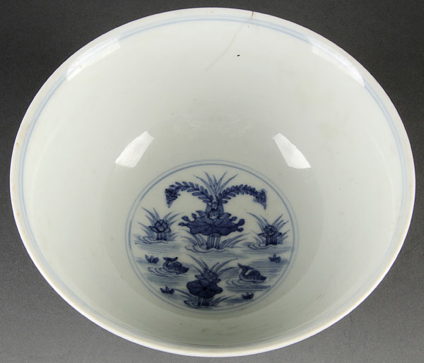 A CHINESE QING DYNASTY BLUE AND WHITE " DUCKS AND FLORALS" PORCELAIN BOWL. Very finely painted within alternating scene of aquatic plants and alternating water fowl with matching interior tando, raised on a short foot rim containing an Imperial six character Kangxi mark. Hairline with remnants of early repair. Diameter 7 inches (18 cm).
