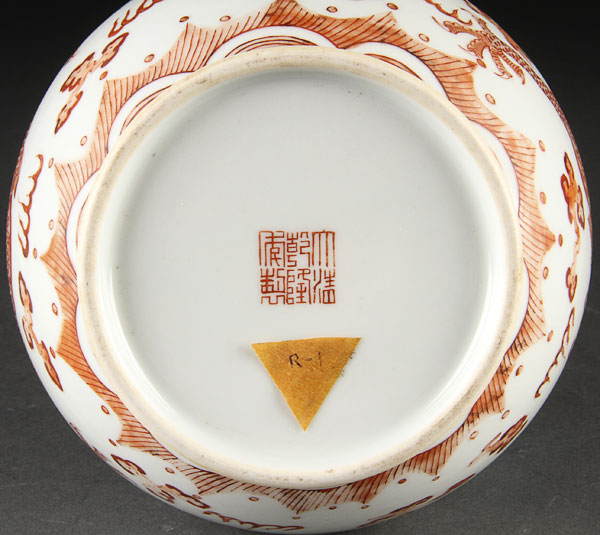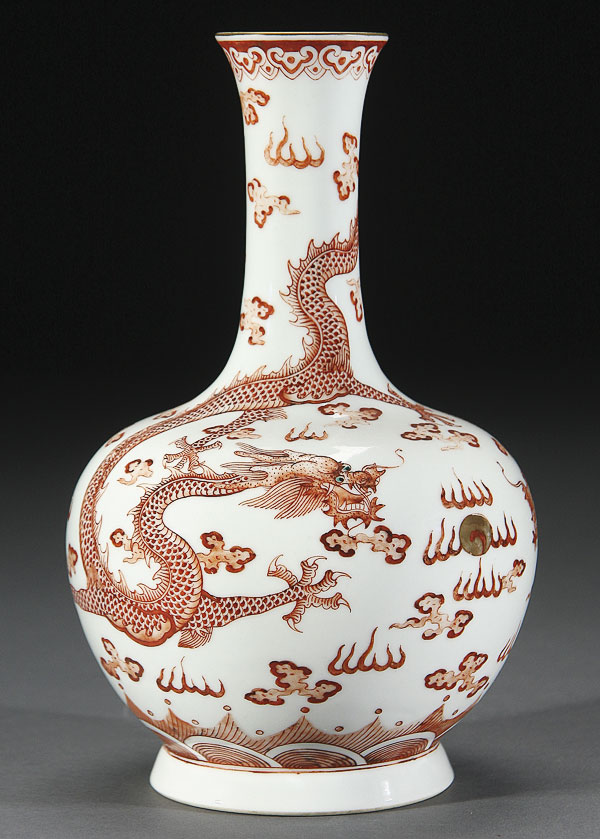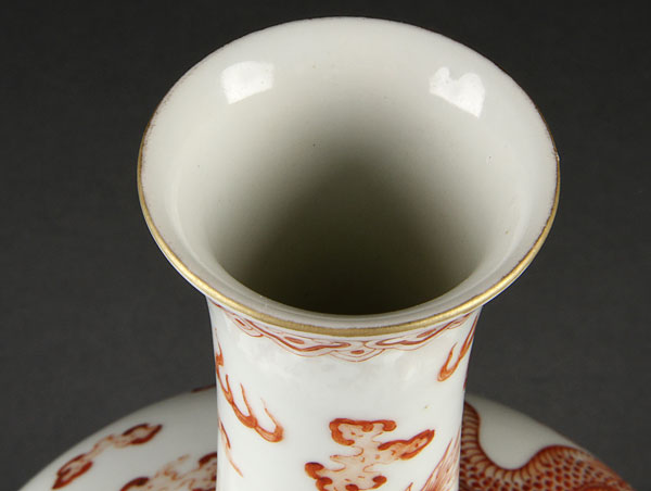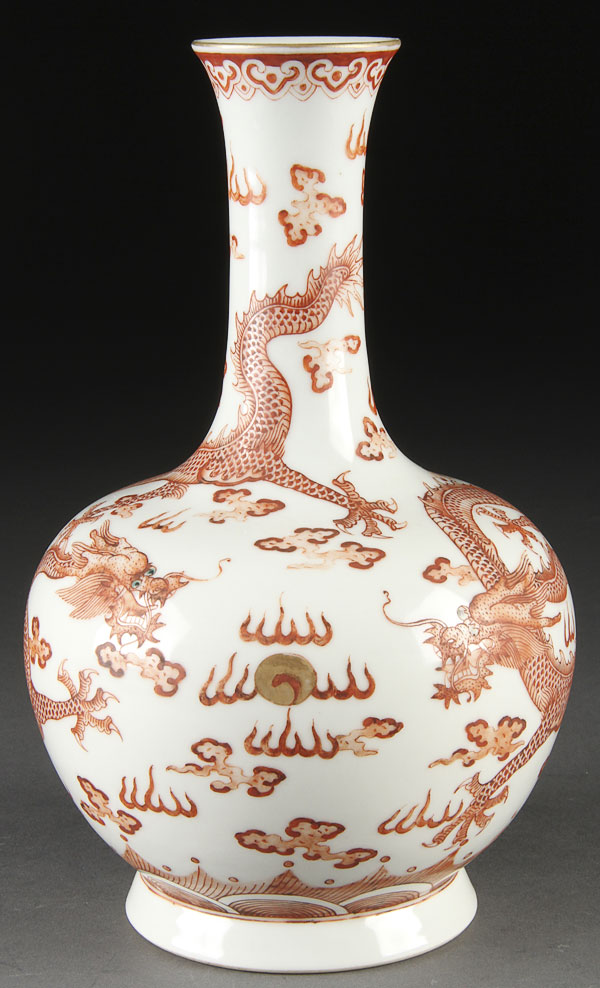 A FINE CHINESE MING STYLE COPPER RED DECORATED PORCELAIN DRAGON VASE OF BOTTLE FORM. Finely painted with two well detailed copper red dragons with enameled eyes among stylized clouds and flames, raised on a short flaring foot rim with Qianlong seal mark. Height 8.875 inches (22.3 cm).