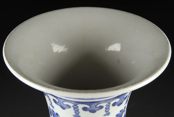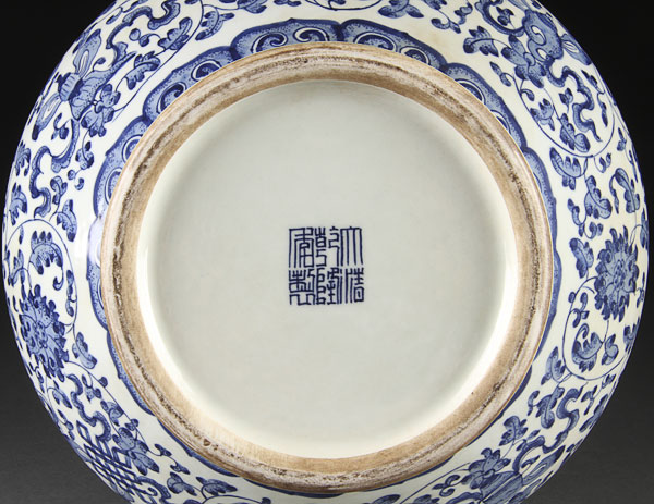 A LARGE AND IMPRESSIVE CHINESE BLUE AND WHITE "INTERLOCKING FLOWER" PORCELAIN PEAR SHAPED VASE. Finely painted with scrolling lotus blossoms and foliates raised on a wasted foot rim with stylized waves, blue Qianlong seal mark under glaze. Height 17.125 inches (43.5 cm).