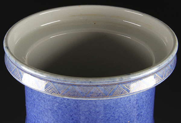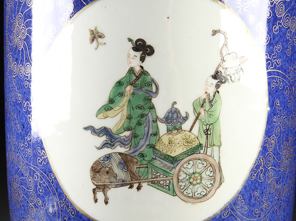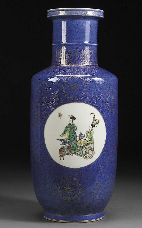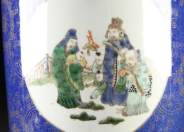 A LARGE CHINESE DOUCAI AND BLUE GROUND PORCELAIN ROULEAU "IMMORTALS" VASE. Finely decorated with three longevity immortals and attendants in tando, the verso with figures and auspicious symbols reserved on an underglaze powder blue ground under an all over scrolling gilt tracery, six character Kangxi mark with double blue circles. Height 21 inches (53.5 cm).