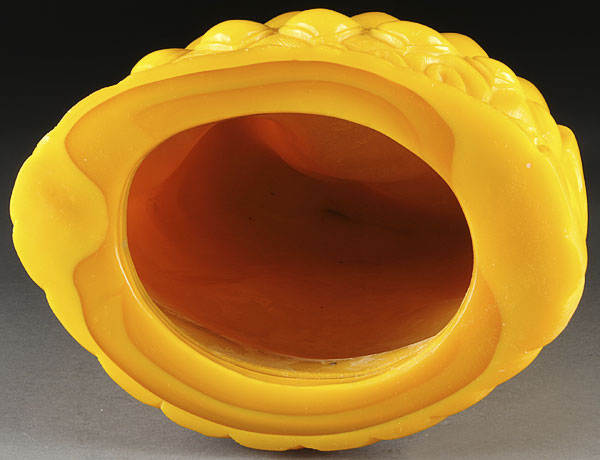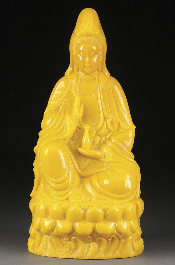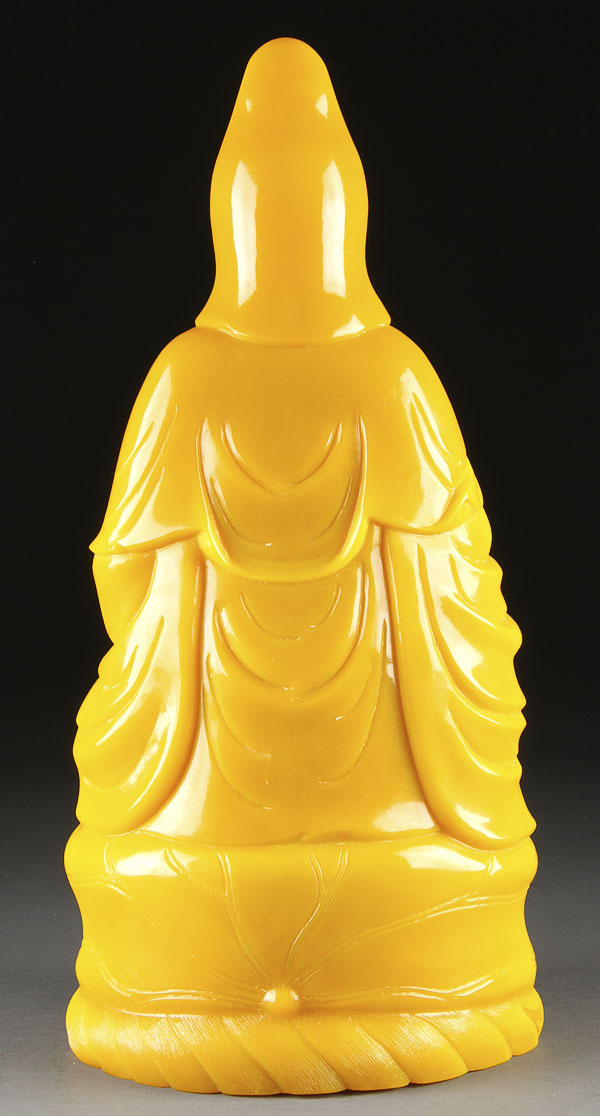 A LARGE CHINESE IMPERIAL YELLOW BEIJING CARVED AND MOLDED GLASS GUANYIN . Depicted seated on a lotus blossom base. Height 18.25 inches (46.5 cm). Provenance: I.M. Chait, September 2004, Lot 274.