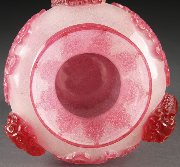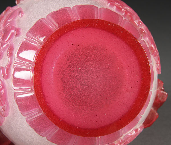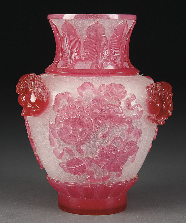 A VERY FINE CHINESE CARVED AND MOLDED BEIJING GLASS VASE OF BALUSTER FORM. In gray translucent speckled glass overlaid with ruby colored glass and carved with foo dogs and Buddhist symbols in deep relief below a band of lappets. Height 7.125 inches (18 cm).