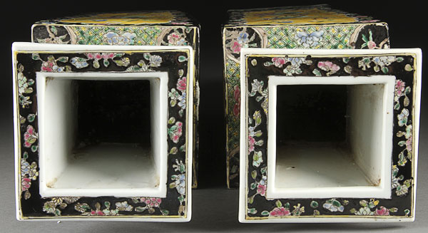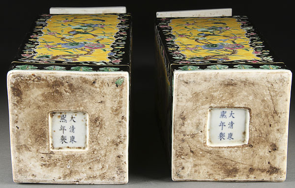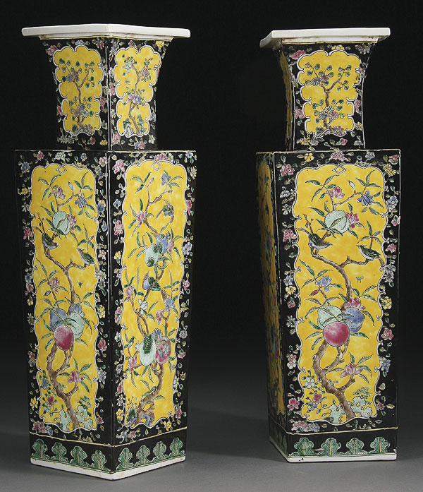 A LARGE PAIR OF YELLOW AND BLACK GROUND FAMILLE ROSE " PEACHES AND BIRDS" VASES. Of modified rectangular form, finely decorated with floral branches, birds, peaches, pomegranate, and florals. The base with recessed Kangxi seal mark in blue underglaze. Height 19.75 inches (15 cm).