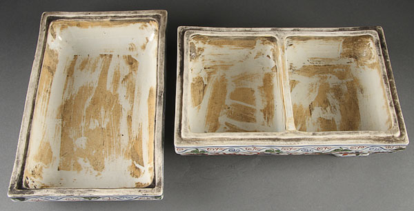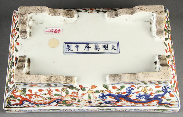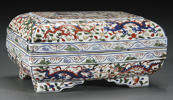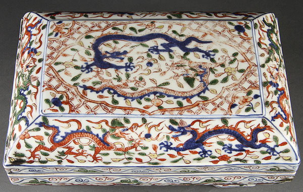 A WANLI STYLE WUCAI DECORATED PORCELAIN "DRAGONS" LIDDED DOUBLE BOX. With all over design of opposing underglaze blue and copper red dragons amidst scrolling foliates, raised on bracket feet, the base with rectangular Wanli mark. Length 9.625 inches (15.5 cm), height 4.625 inches (11.5 cm).