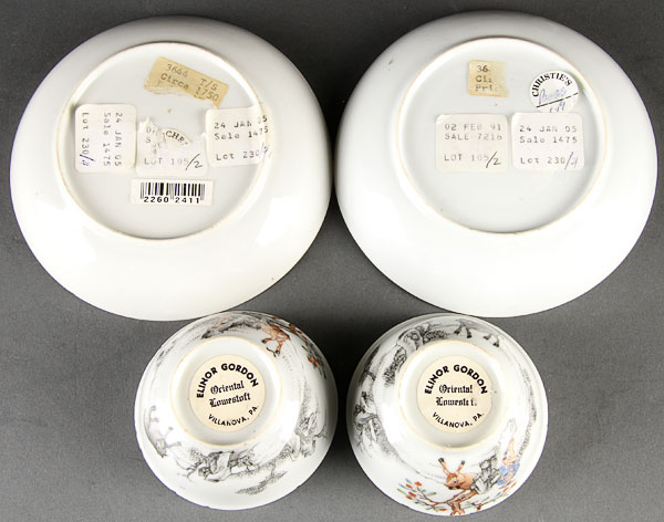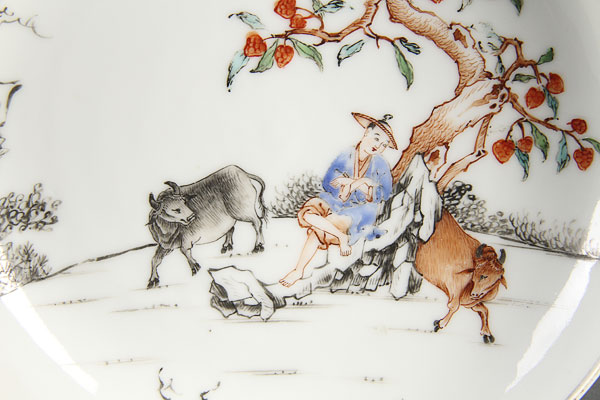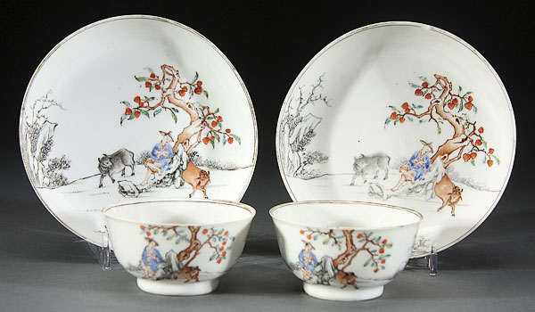 A PAIR OF CHINESE EXPORT PORCELAIN TEA BOWLS AND SAUCERS, CIRCA 1745. Each molded in thin porcelain, finely enameled with a Chinese shepherd below a polychrome fruit tree surrounded by onyx and scenery in grisaille. Diameter 5.25 inches (13.3 cm).