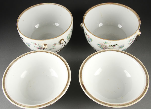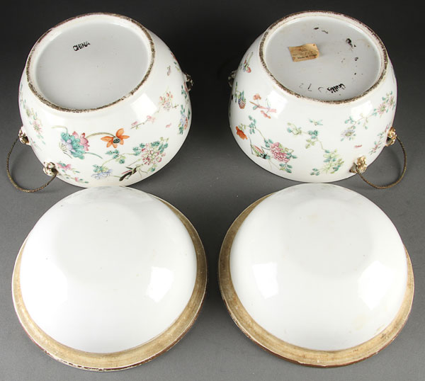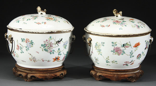 A PAIR OF CHINESE FAMILLE ROSE "INSECTS AND FLOWERS" PORCELAIN FRUIT COOLERS, PROBABLY 19TH CENTURY. Comprising a bowl and cover, each finely enameled with floral blossom and various insect types, with fitted liner below a domed cover with foo dog finial. Height 7.75 inches (19.7 cm).