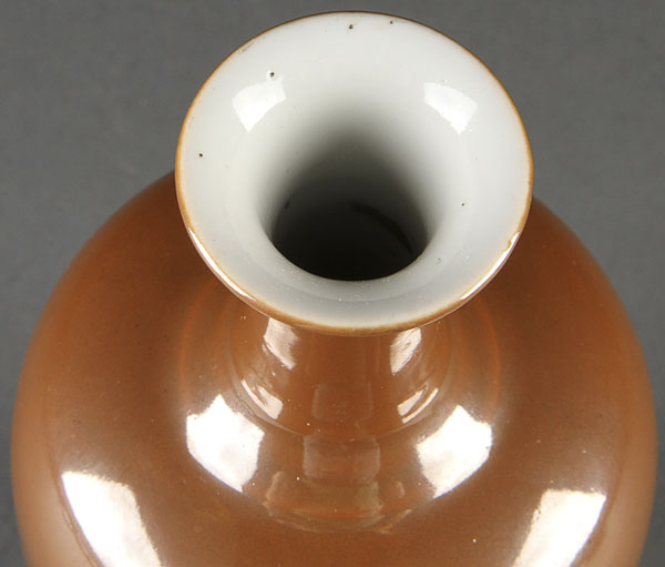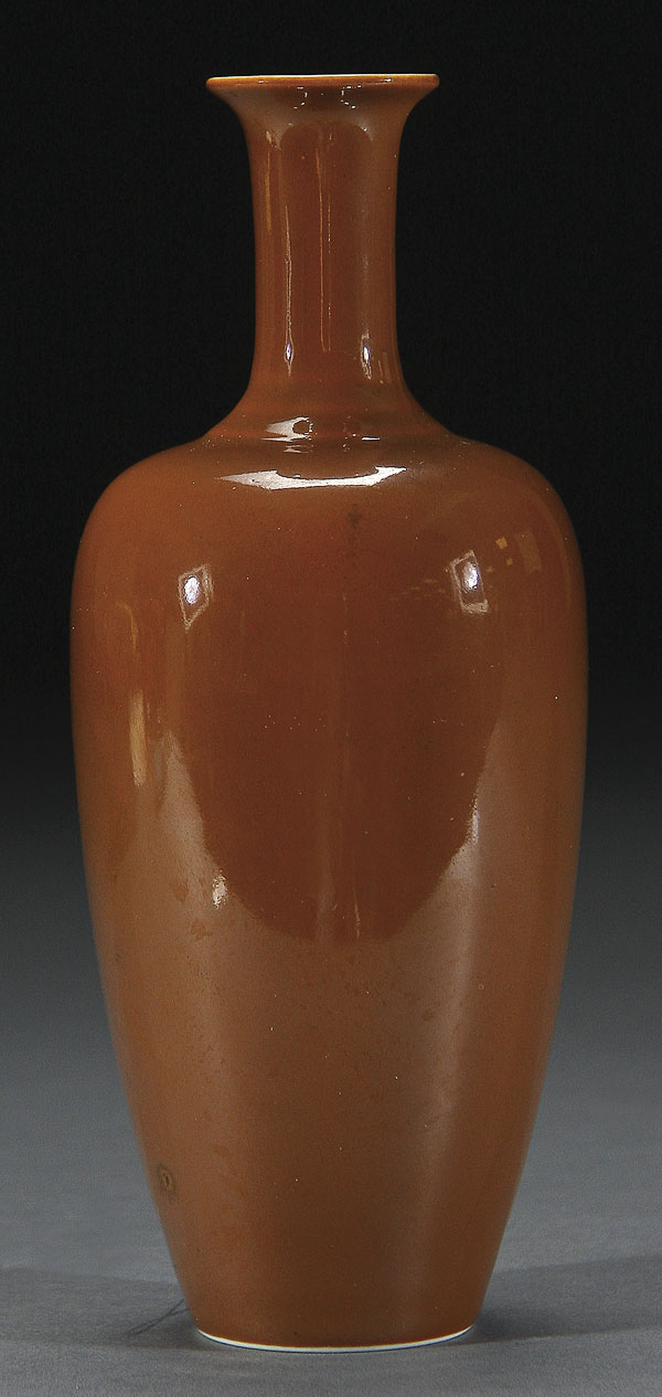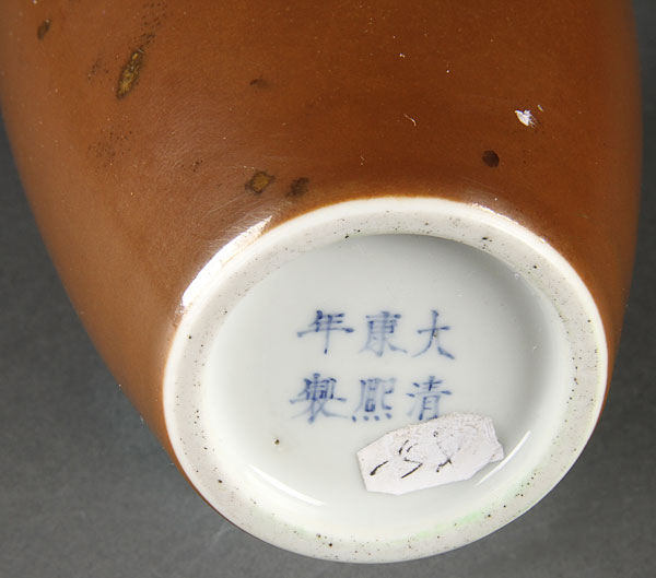 A CHINESE TEA DUST GLAZED BOTTLE VASE. Of ovoid form with elongated neck, the base with six character Kangxi reign mark. Height 8 inches (20.3 cm).