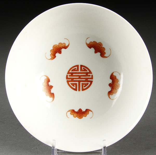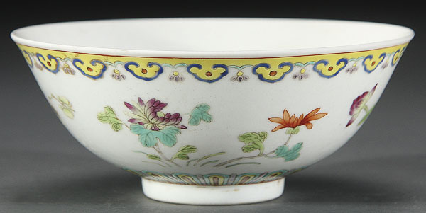 A CHINESE FAMILLE ROSE PORCELAIN "FOUR BATS" BOWL. Finely enameled with polychrome florals below a Ruyi and yellow ground boarder rim. The interior with four copper red bats, raised on a short foot rim with Jaiquing red seal mark. Diameter 5.375 inches (13.5 cm).