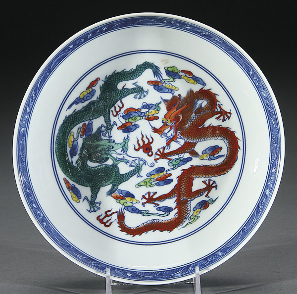 A CHINESE DOUCAI PORCELAIN "DRAGONS" LOW BOWL. The finely molded porcelain bowl with interior decoration of an opposing green and red dragon, below a stylized wave form border. The underside decorated with flying cranes and polychrome cloud forms. Six character Kangxi mark with a double blue circles. Diameter 7.75 inches (19.7 cm).