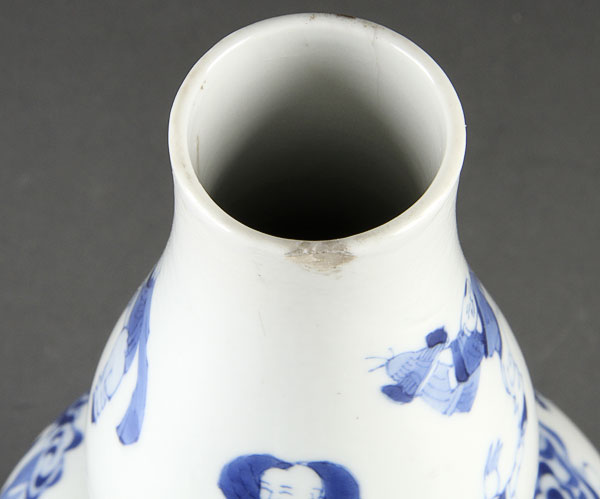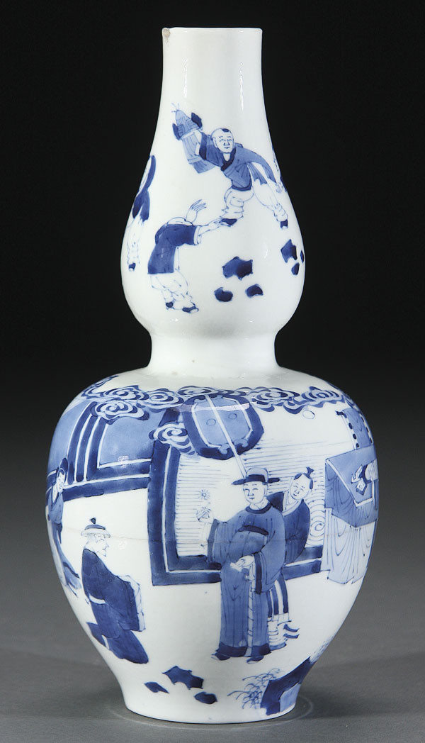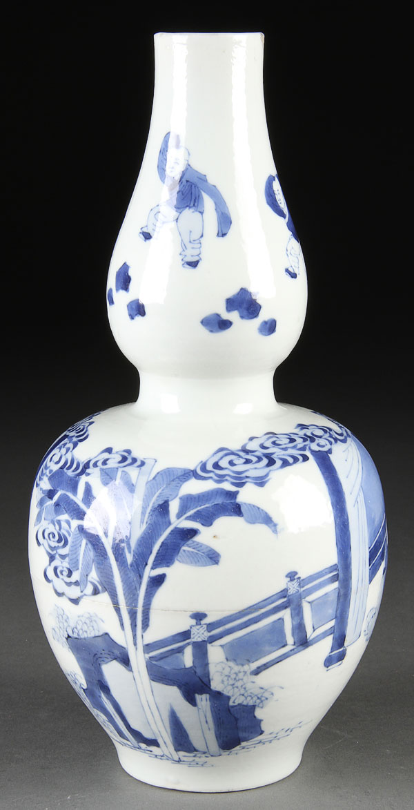 A FINE CHINESE BLUE AND WHITE PORCELAIN "FIGURES" DOUBLE GOURD VASE. Finely painted with a scene of playful young boys and figures in a court setting, unmarked. Height 9.75 inches (25 cm).