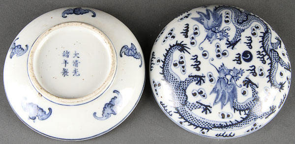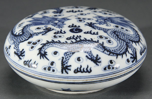 A FINE CHINESE QING PERIOD BLUE AND WHITE PORCELAIN "DRAGONS" LIDDED INK BOX. Decorated with well detailed opposing dragons and cloud forms in underglaze blue, the base with five bats, and raised on a short foot rim with six character Qianlong mark. Diameter 4.5 inches (11.5 cm).